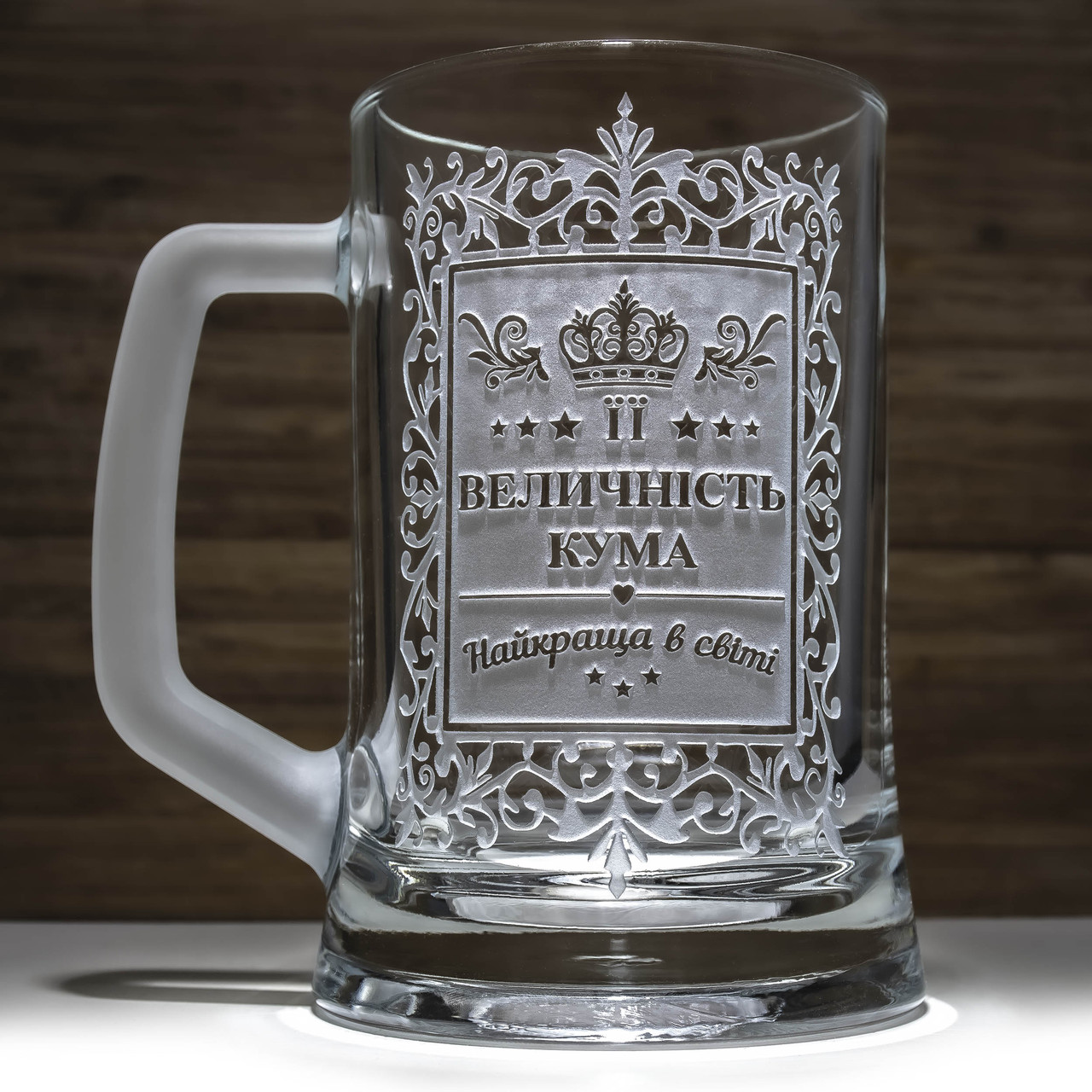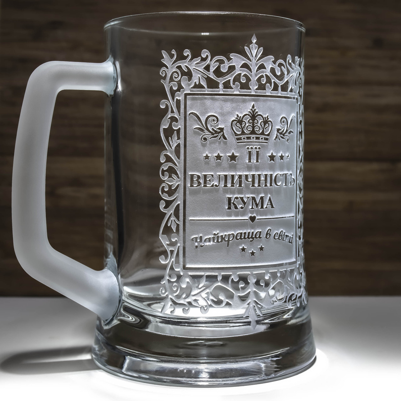 Подаруйте незабутні емоції вашій кумі з унікальним пивним бокалом з глибоким механічним гравіюванням напису "Її Величність Кума" з матовою ручкою в подарунковій коробці! Це не просто подарунок, це справжній аксесуар для королівського насолоди пивом.