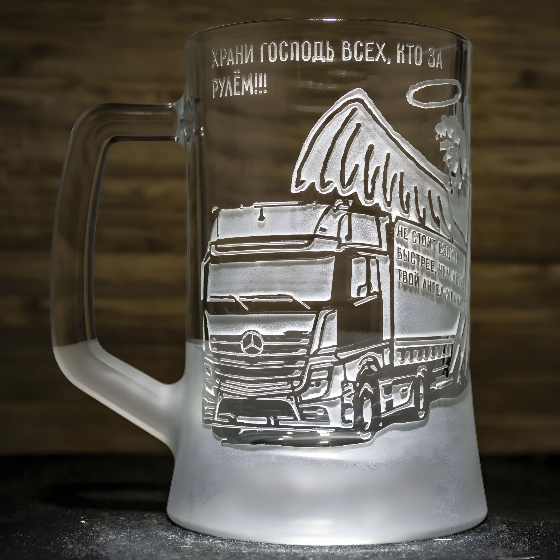 Cкляний кухоль для пива з ручним механічним гравіюванням Mercedes Мерседес фура з напівпричепом Ангел-охоронець у подарунковій коробці