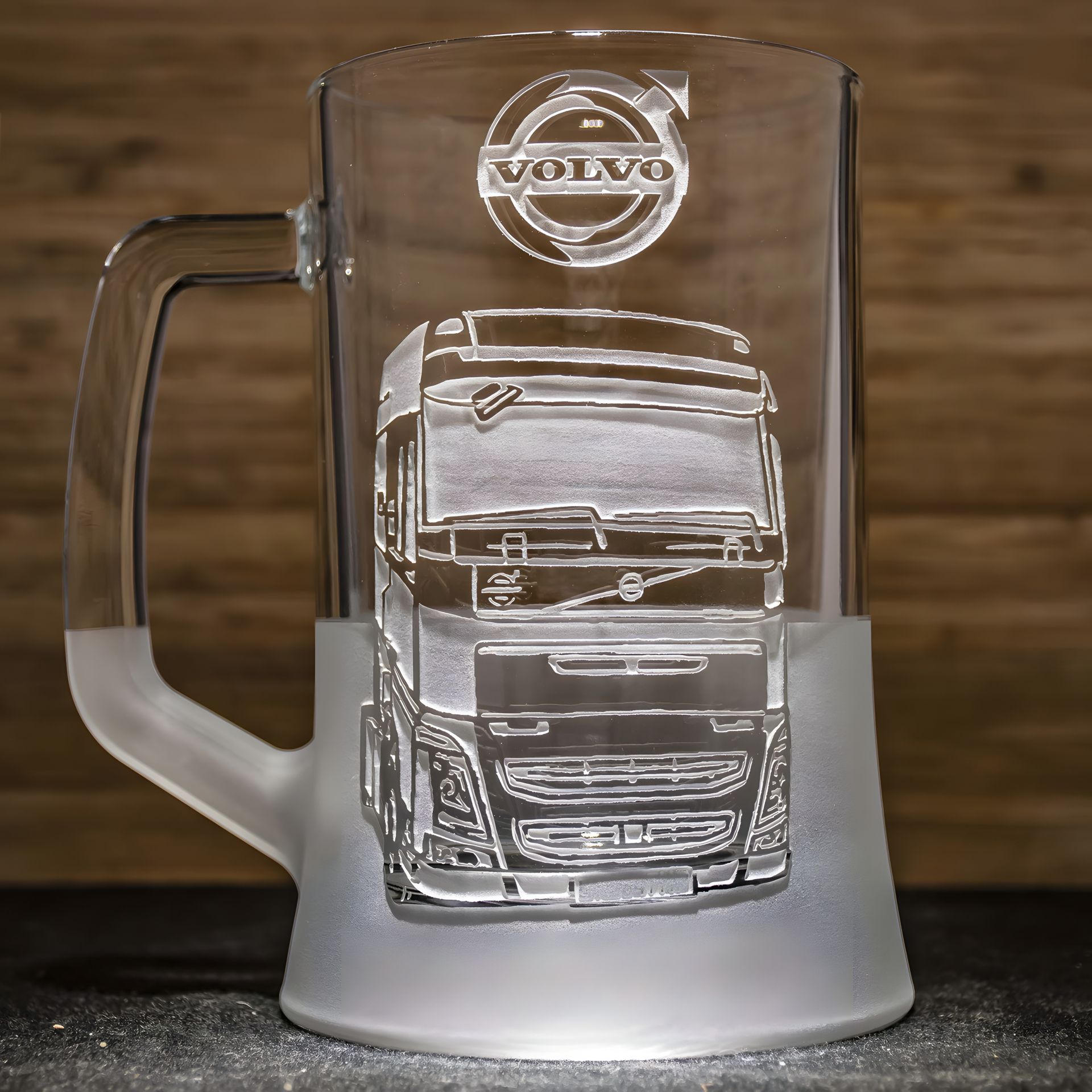 Cкляний кухоль для пива з ручним механічним гравіюванням VOLVO тягач у подарунковій коробці