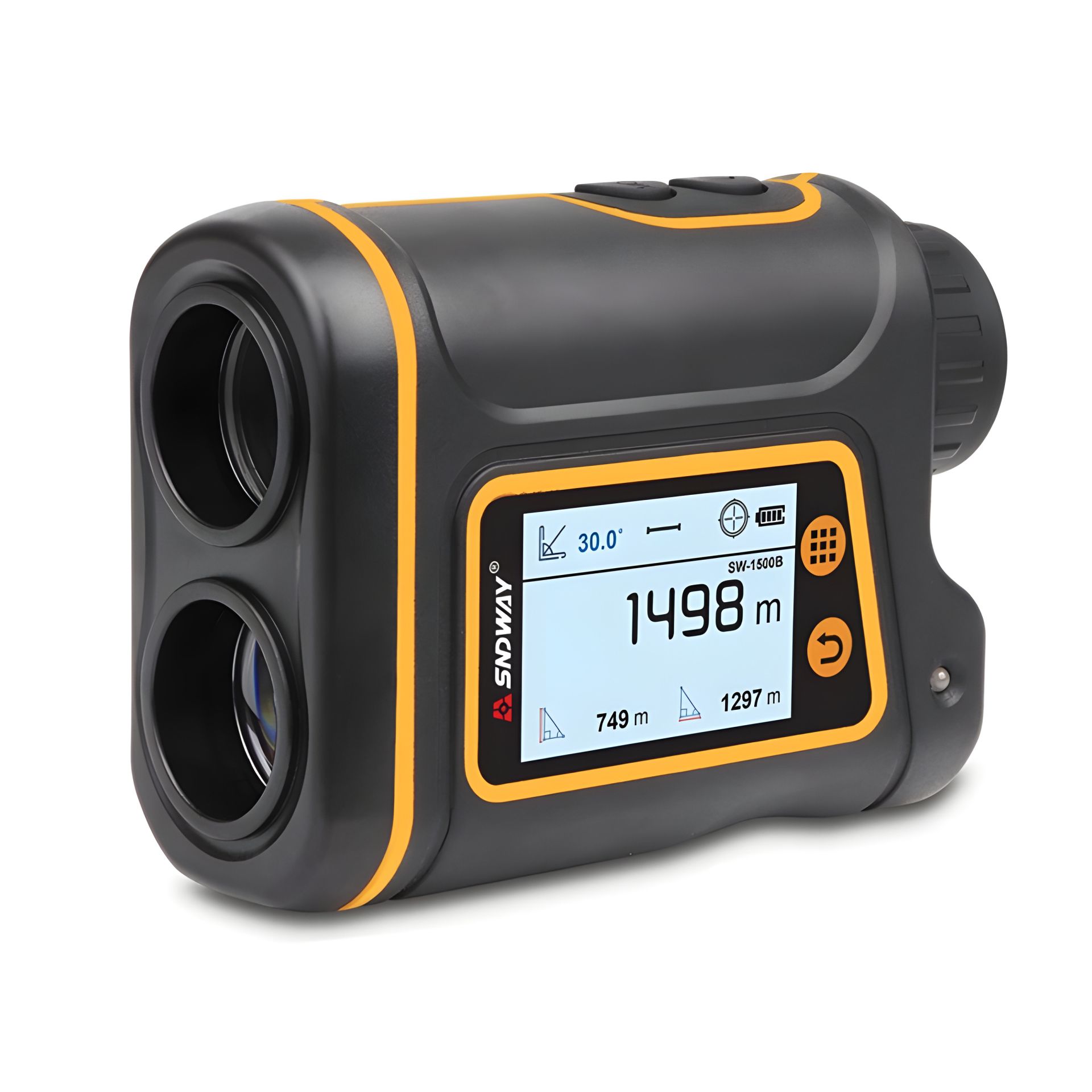 SNDWAY SW-1500B - професійний лазерний далекомір, який призначений для ефективного вимірювання дистанції в діапазоні до 1500 метрів, з функціями вимірювання кута нахилу, розрахунку швидкості об'єкта, площі та об'єму. Вбудований цифровий рівень нахилу працює в діапазоні: від -90º до +90º, а також використовується для виконання непрямих вимірювань на основі теореми Піфагора, наприклад: значень висоти на підставі виміряної відстані до вершини та кута нахилу.