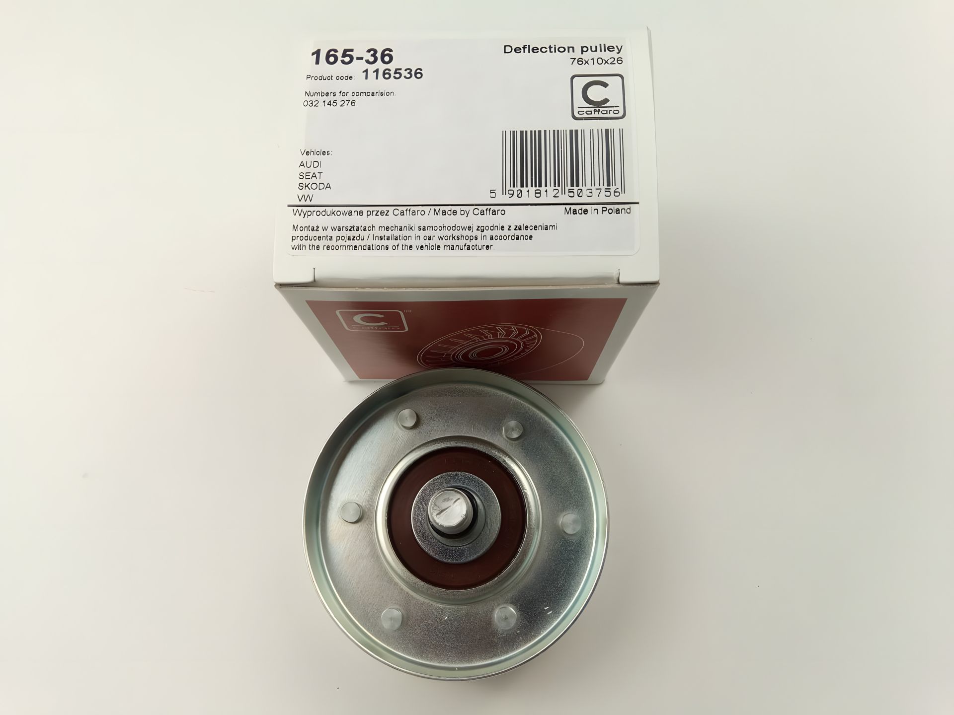 Ролик ременя генератора натяжний VAG, CAFFARO (165-36) метал. Внутрішній діаметр [мм]: 10 Матеріал виготовлення: Метал Зовнішній діаметр [мм]: 76 76x10x26