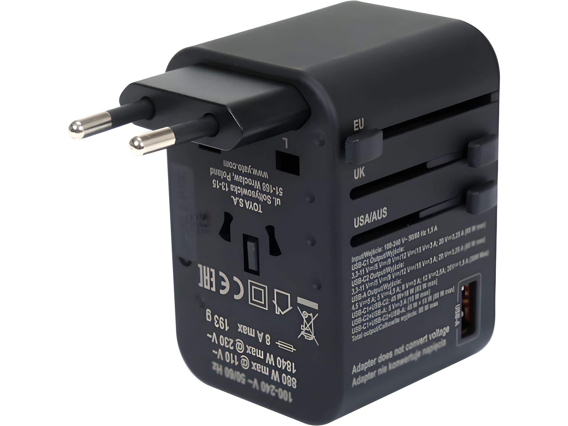 Дорожній адаптер підходить для більш ніж 150 країн із вбудованим зарядним пристроєм із трьома портами USB з технологією швидкого заряджання. Вбудований блок живлення загальною потужністю 65 Вт замінить зарядні пристрої для телефонів, планшетів та навіть бізнес-ноутбуків. Замок запобігає випадковому ковзанню штифтів у корпус. Адаптер захищений від короткого замикання доступним керамічним запобіжником. Корпус із міцного вогнестійкого пластику. Функція адаптера: універсальна розетка із захистом від дітей чотири види виделок максимальна потужність при 230 В: 1840 Вт керамічний запобіжник: 8 А розміри: 68 × 53 × 52 мм запасний запобіжник в комплекті Функція живлення: максимальна потужність: 65 Вт/3 А, 2 В/3,25 А (макс. 65 Вт) Роз'єм USB-A з QC. технології. 3. 0 (швидка зарядка): 5 В/4,5 А, 9 В/3 А, 12 В/2,5 А, 20 В/1,5 А (макс. 30 Вт) Примітка Адаптер не перетворює мережеву напругу 230 В на 110 В. Технологія швидкого заряджання Майже всі сучасні мобільні пристрої, такі як смартфони та планшети, підтримують технологію швидкого заряджання. Найпопулярнішими є PD і QC. З погляду телеграфу, ця технологія дозволяє заряджати акумулятори при вищій напрузі. Спеціальний чіп керування батареєю спілкується із зарядним пристроєм, здатним визначати його можливості та адаптуватися до них. Вища напруга дозволяє заряджати меншим струмом, зберігаючи ту ж чи велику потужність. Наприклад, при 5 і 3 А ми отримуємо 15 Вт потужності, при 9 і 2 А ця потужність буде 18 Вт. Різниця у потужності на перший погляд не велика. Однак важливо знати про обмеження як з боку кабелю, так і самої батареї. Чим вищий струм, тим важче для тонких ниток кабелю, його штекерів та системи керування акумулятором. Наприклад, хоча зарядний пристрій може забезпечити 3 А струму при напрузі 5, система управління кабелем і батареєю на телефоні зазвичай витримує не більше 2 А, що в кінцевому підсумку перетворюється на вихідну потужність 10 Вт. Однак, якщо ви збільшите напруги, наприклад, до 9 В, ви матимете 18 Вт при такому ж струмі зарядки, тобто пристрій буде заряджатися майже вдвічі швидше. Сучасні смартфони все частіше виготовляються без зарядних пристроїв. Універсальний дорожній адаптер Yato – це не тільки незамінний продукт для подорожей за кордон, але й якісний швидкий зарядний пристрій з безліччю підтверджених тестами параметрів, за допомогою якого ми можемо безпечно заряджати як смартфони, так і планшети.