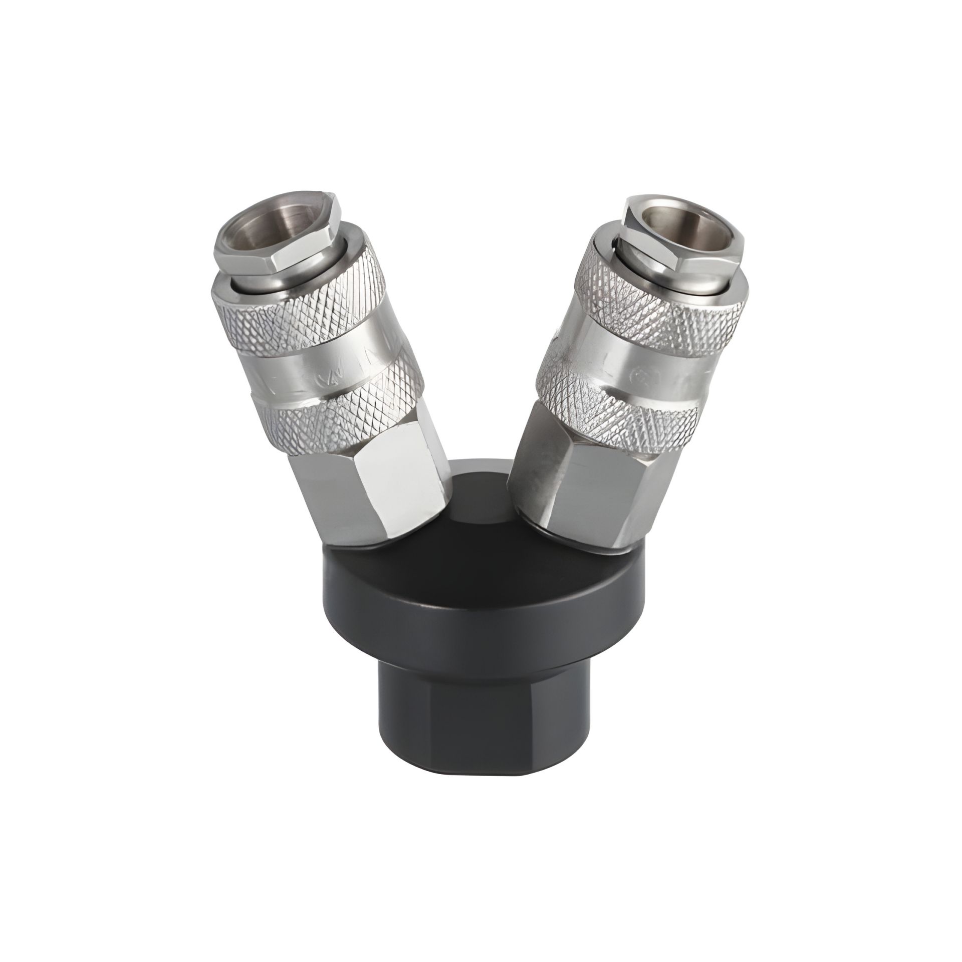 V-подібний розгалужувач повітря дозволяє одночасно під'єднати 2-х користувачів повітря і побудувати потужну пневматичну систему з тиском до 10 бар. На вході повітря встановлена різьба 1/4", а на виходах - надійні універсальні швидкороз'ємні з'єднання, які дозволяють легко підключити шланги високого тиску з пневмоінструментом.