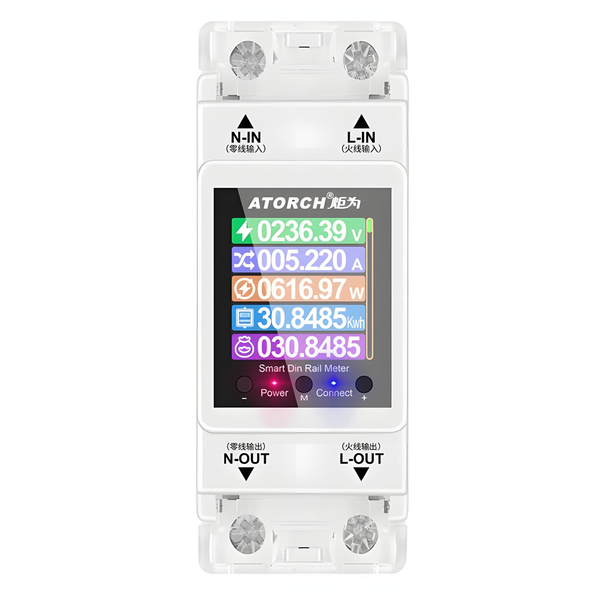 - Моніторит у реальному часі показників електроенергії за 7 параметрами: поточна напруга в мережі, поточний споживаний струм, поточна споживана потужність, частота мережі, PF фактор, кількість спожитої електроенергії з моменту включення та загальна вартість спожитої електроенергії.