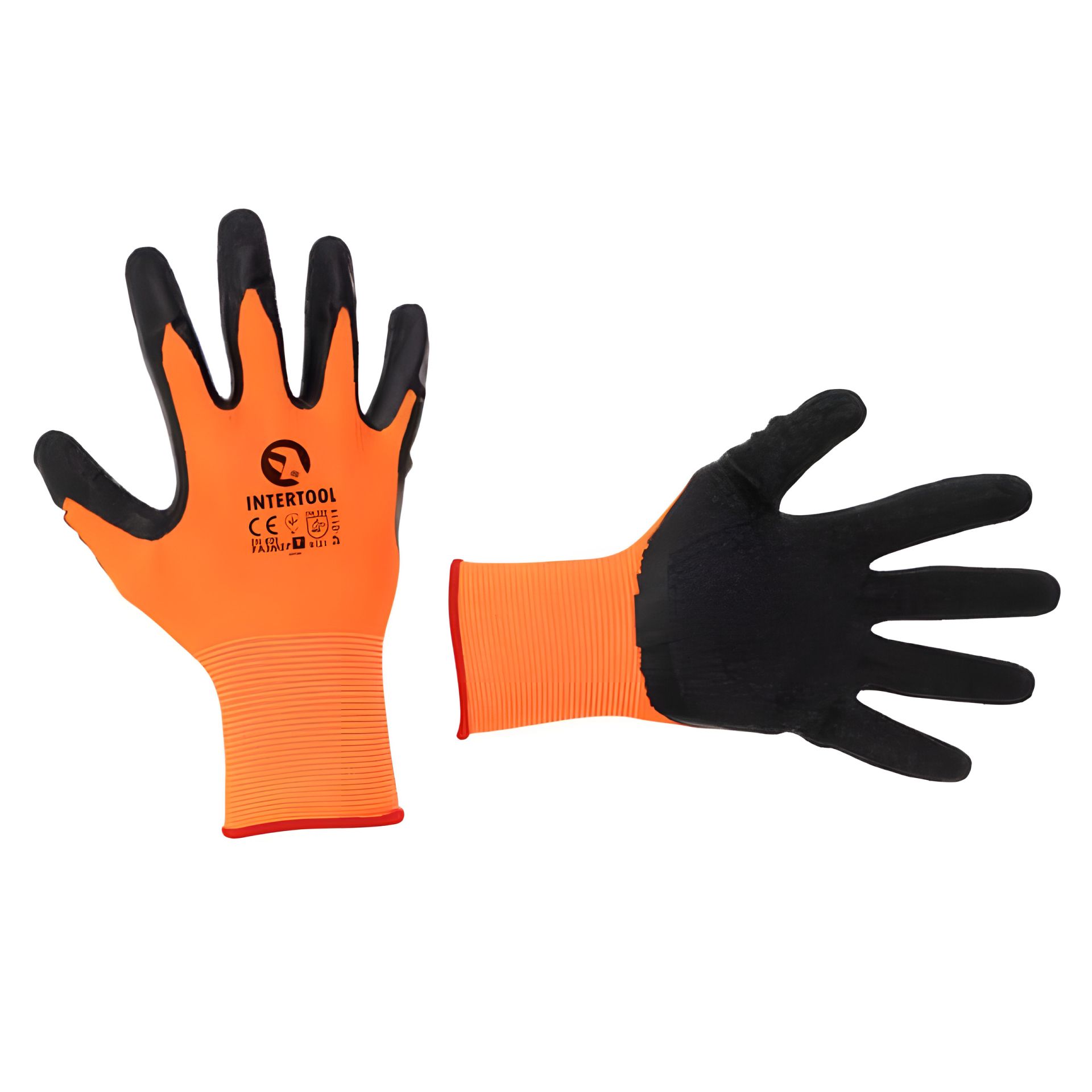 Трикотажна рукавичка з покриттям з чорного спіненого латексу, синтетична, помаранчева, 11" INTERTOOL SP-0119