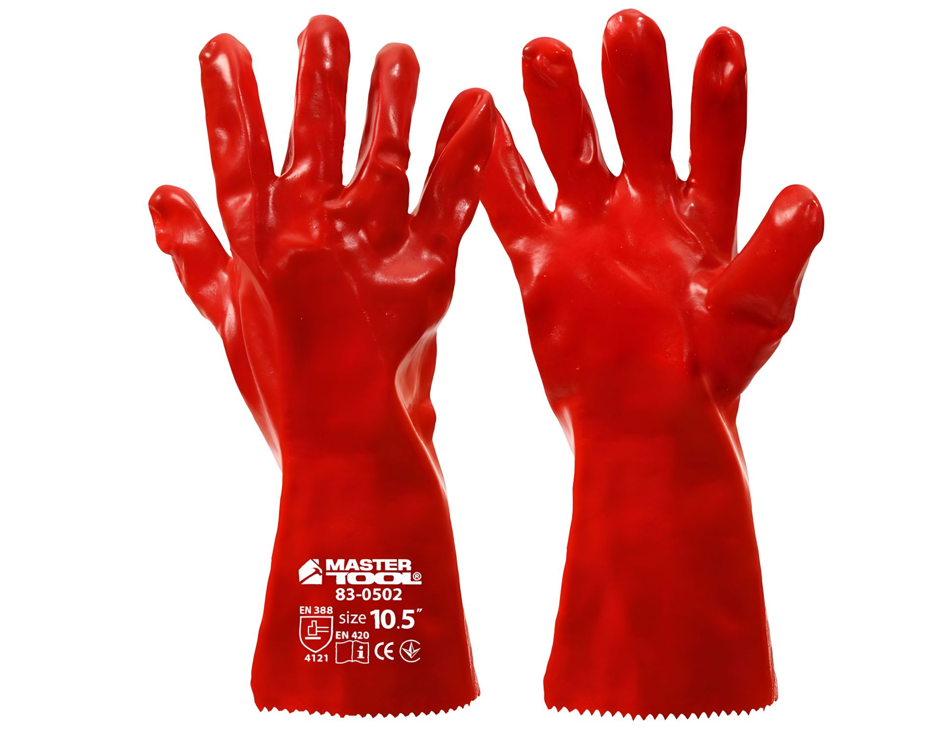 Кислотостійкі рукавички з ПВХ покриттям, манжет та крага 350 мм 10.5", червоні, MASTERTOOL 83-0502