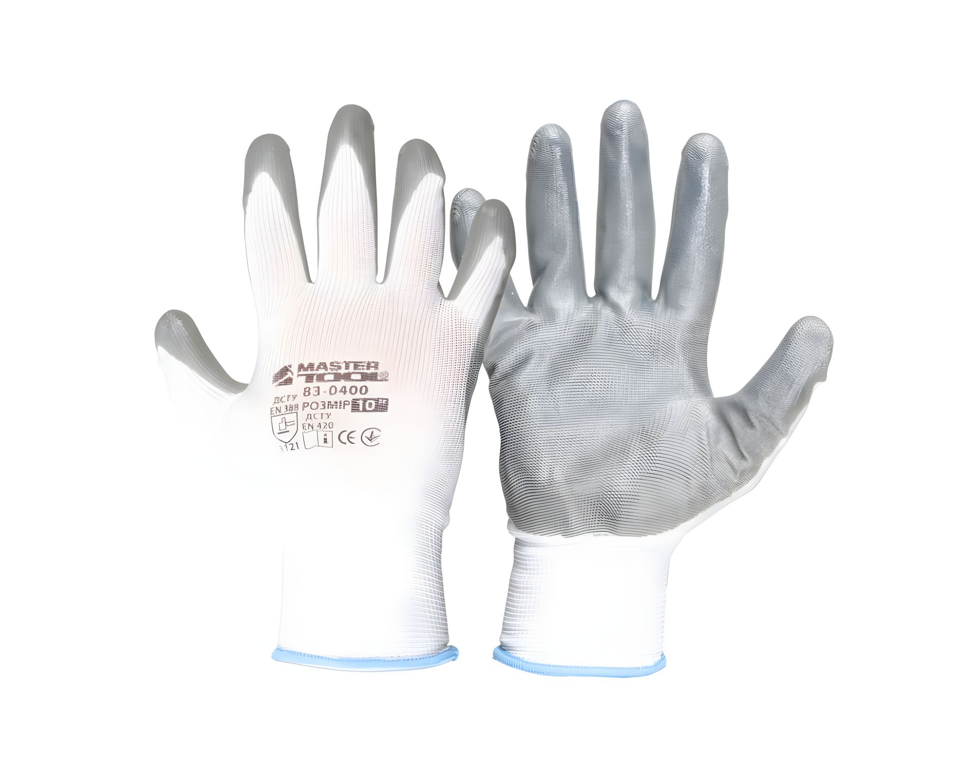 Безшовні трикотажні рукавички з нітриловим покриттям долоні 10" 12 пар біло-сірі MASTERTOOL 83-0400doz
