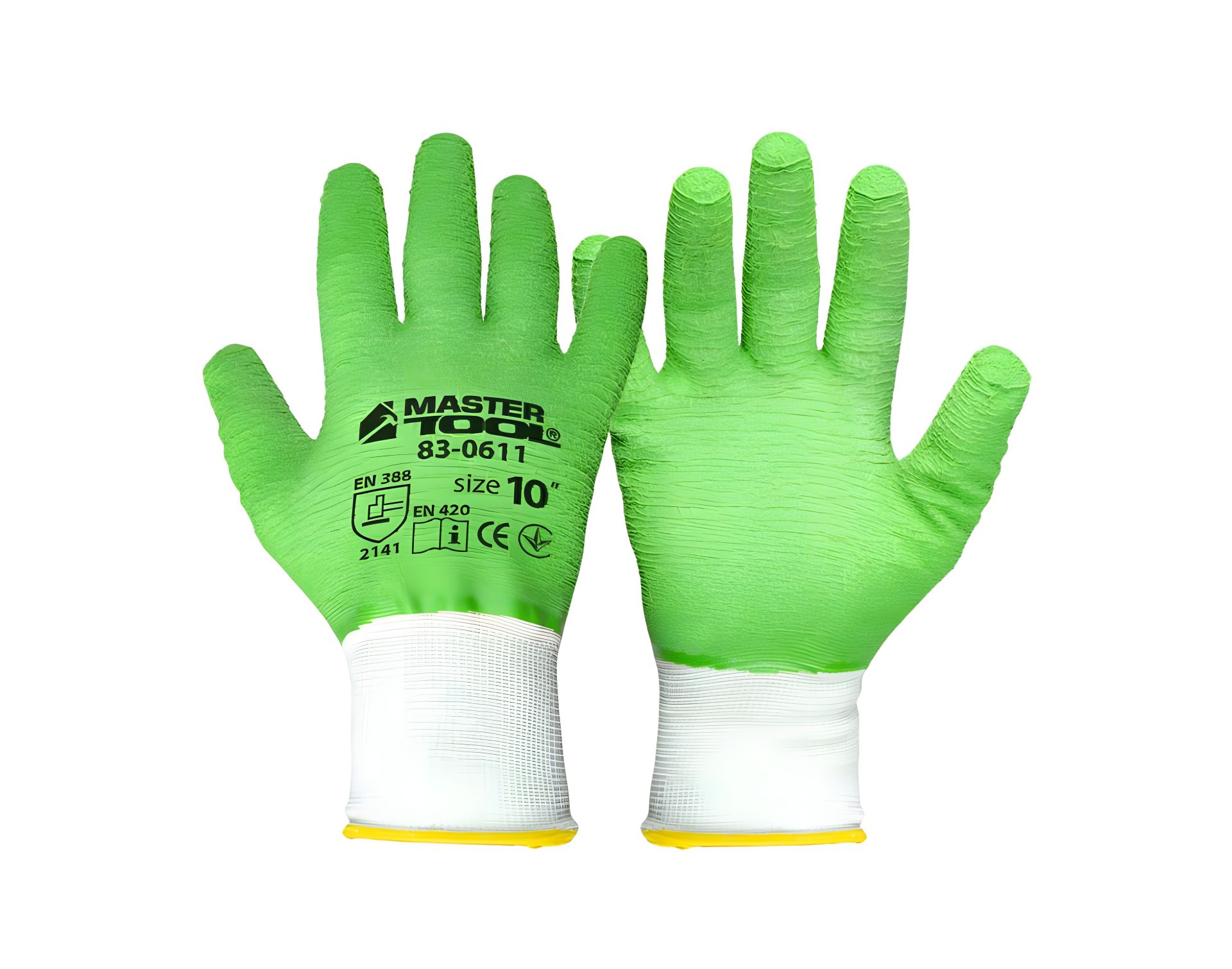 Безшовні рукавички трикотажні повне ребристе латексне покриття 10" підвіс зелені MASTERTOOL 83-0611
