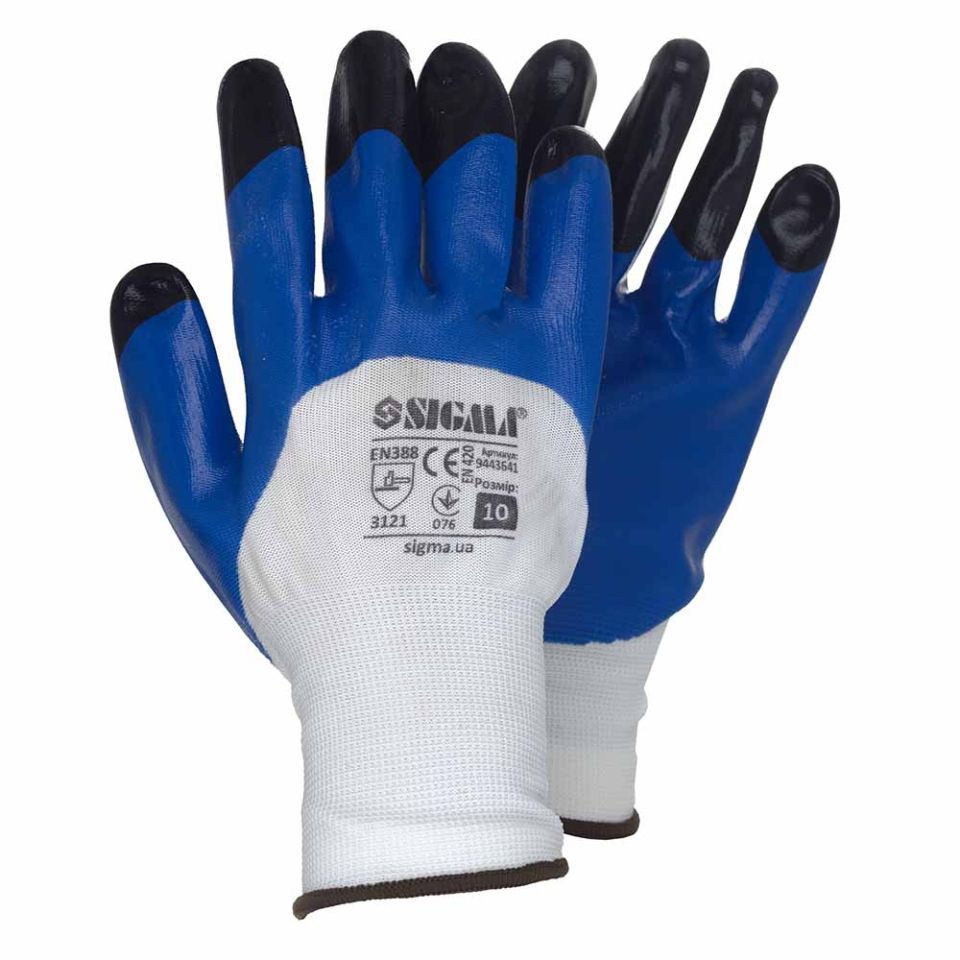Рукавички трикотажні з частковим нітриловим покриттям посилені пальці р10 (синьо-чорні, манжет) SIGMA 9443641