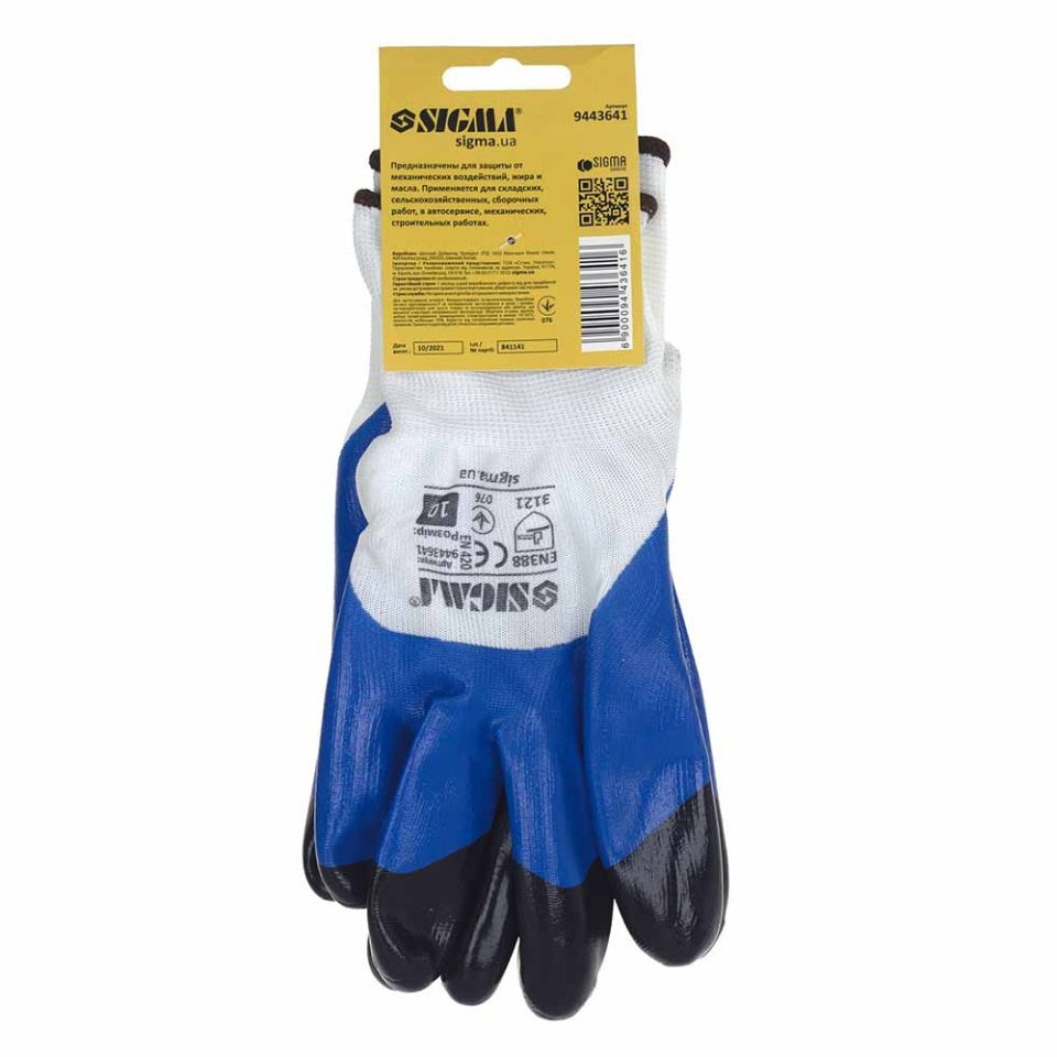Рукавички трикотажні з частковим нітриловим покриттям посилені пальці р10 (синьо-чорні, манжет) SIGMA (9443641) призначені для захисту від механічних впливів, жиру та олії.