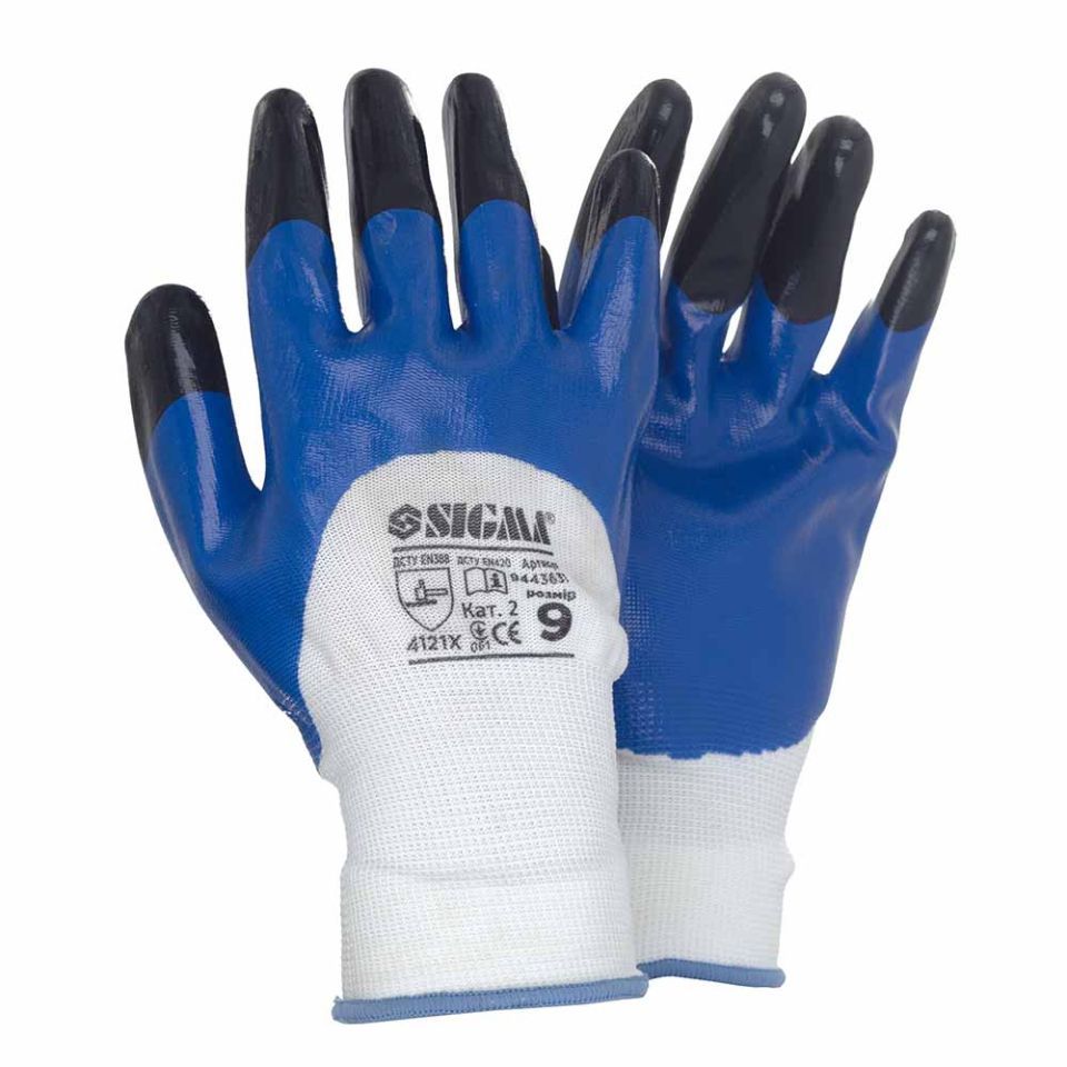 Рукавички трикотажні з частковим нітриловим покриттям посилені пальці р9 (синьо-чорні, манжет) SIGMA (9443631) призначені для захисту від механічних впливів, жиру та олії.