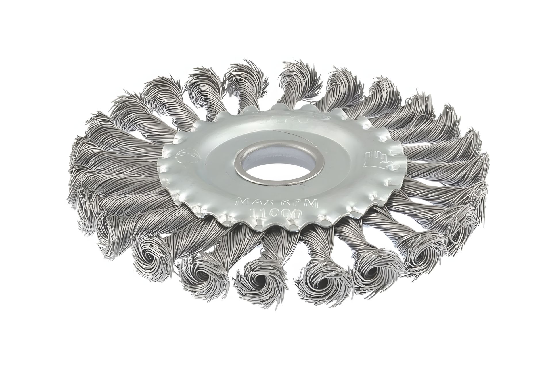 Щітка дискова із плетеного дроту Ø 125х22,2 мм призначена для ефективного очищення металевих поверхонь від іржі, окалини, фарби, нагару та інших забруднень. Завдяки міцному сталевому дроту, скрученому в пучки, забезпечується висока жорсткість, агресивна робота та тривалий термін служби. Посадковий розмір 22,2 мм підходить для більшості кутових шліфувальних машин (болгарок).