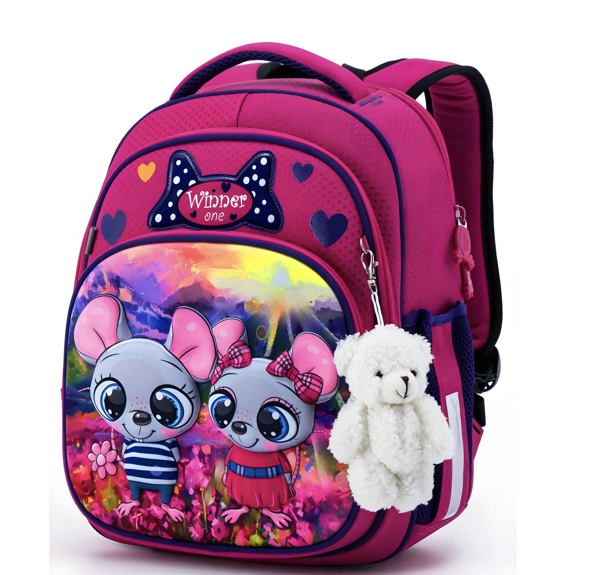 Стильний дизайн та безпека: Ранець виконаний у ніжному рожевому кольорі з миленьким принтом мишок, що робить його привабливим для маленьких дівчаток. Світловідбиваючі елементи забезпечують видимість вашої дитини у темний час доби, підвищуючи безпеку на дорозі.