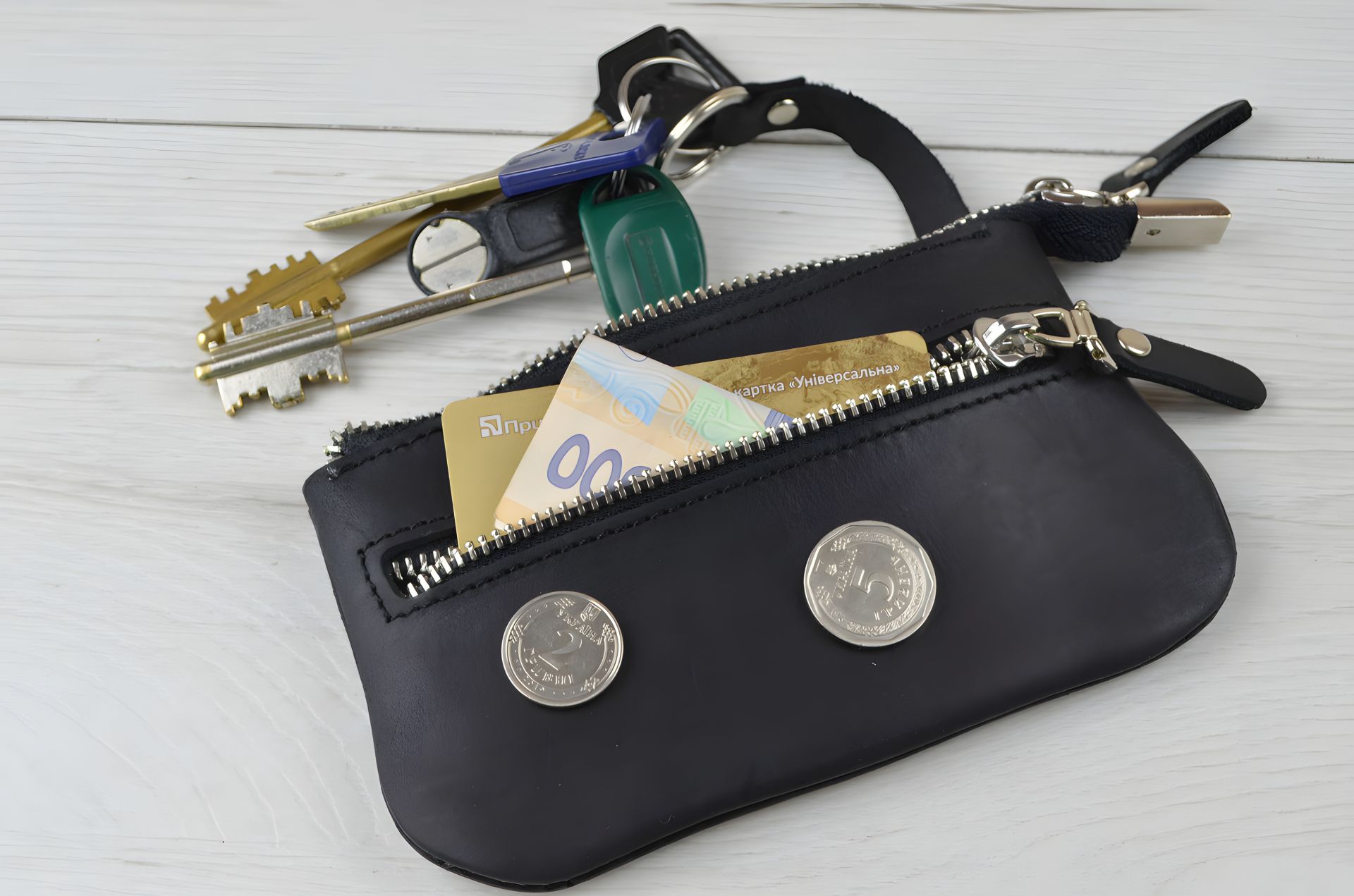 Шкіряна ключниця GS чорногого кольору. Пошита з натуральної шкіри ВРХ, вощеної, вінтажної Crazy Horse ( крейзі хорс) . У ключниці є основний відділ, в якому легко поміщаються довгі ключі до 14 см. На тильній стороні є кишеня на блискавці для дрібниць.