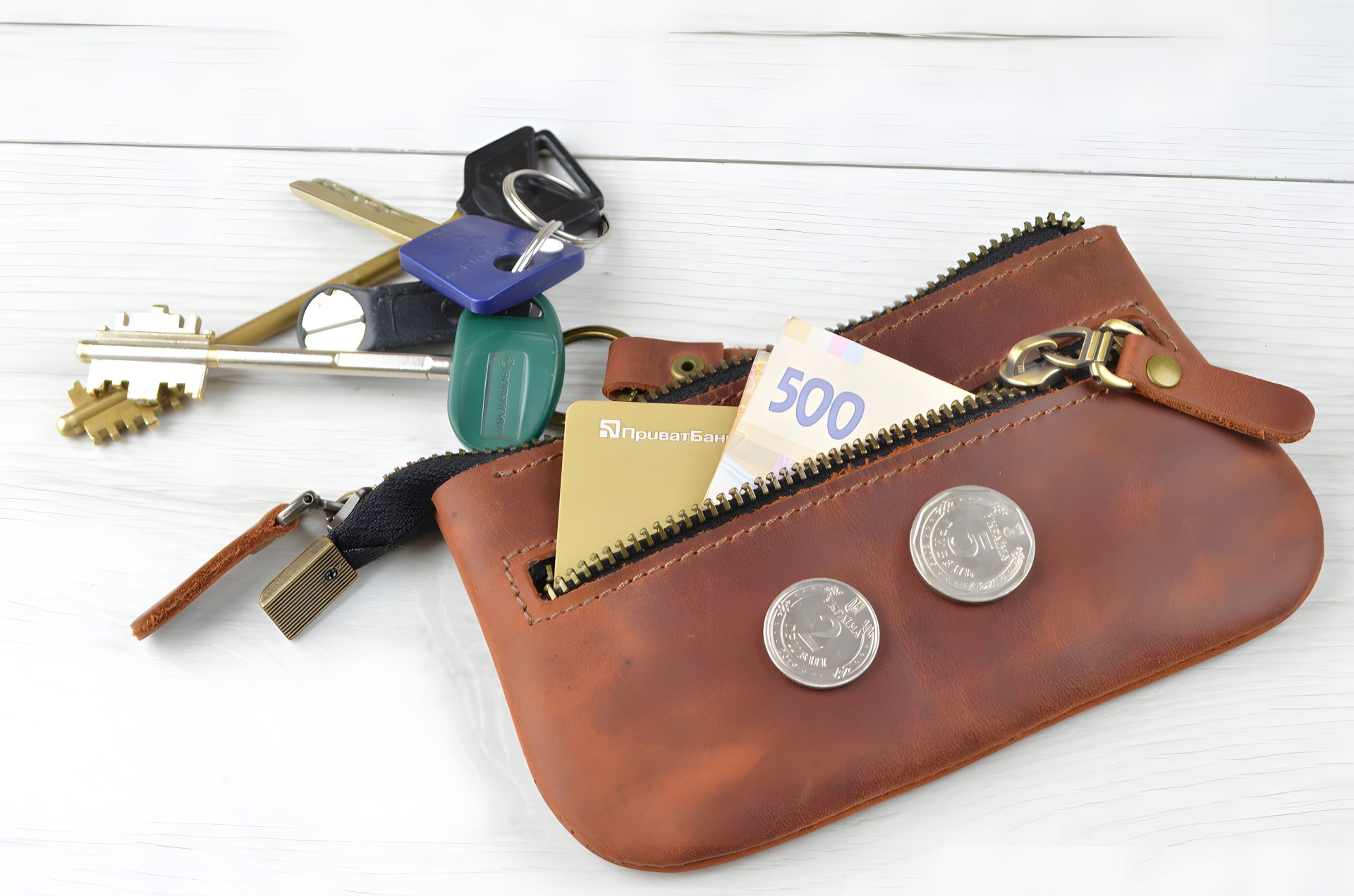 Шкіряна ключниця GS коньячного кольору. Пошита з натуральної шкіри ВРХ, вощеної, вінтажної Crazy Horse ( крейзі хорс) . У ключниці є основний відділ, в якому легко поміщаються довгі ключі до 14 см. На тильній стороні є кишеня на блискавці для дрібниць.