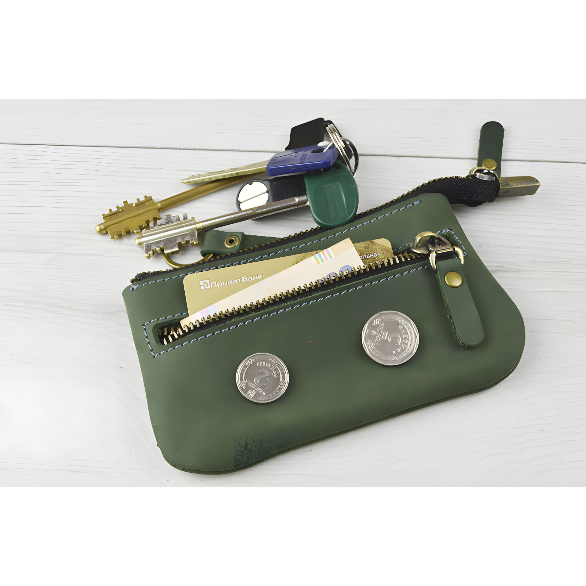 Шкіряна ключниця GS зеленого кольору. Пошита з натуральної шкіри ВРХ, вощеної, вінтажної Crazy Horse ( крейзі хорс) . У ключниці є основний відділ, в якому легко поміщаються довгі ключі до 14 см. На тильній стороні є кишеня на блискавці для дрібниць.