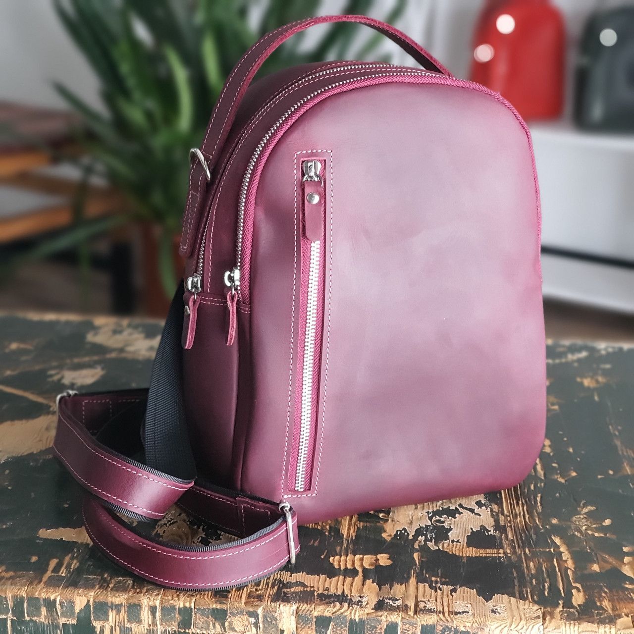 Жіночий шкіряний рюкзак GS бордового кольору. Пошитий з щільної телячої шкіри з вінтажним ефектом старіння (crazy horse). У рюкзаку 2 відділи. Ширина основного відділу 9 см Всередині - потайна кишеня на блискавці і кишеня по- меньше. Другий відділ шириною 2см. Спереду велика кишеня на блискавці. У рюкзаку є ручка для перенесення і 2 шлейки.