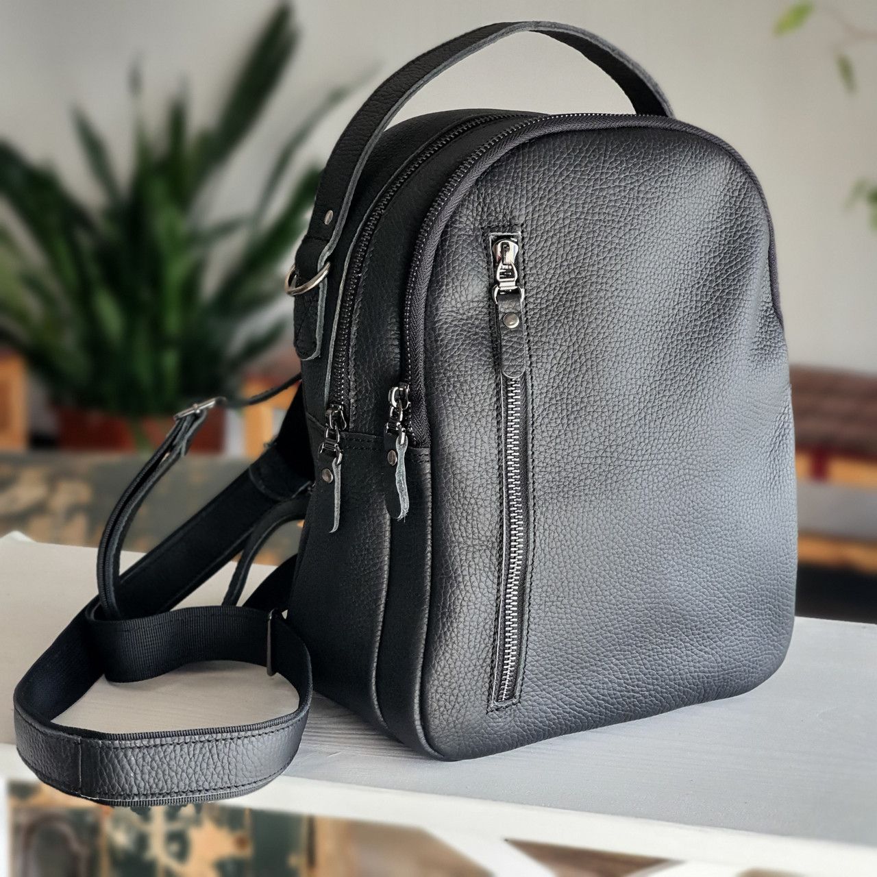 Жіночий шкіряний рюкзак GS чорного кольору. Пошитий з щільної телячої шкіри з фактурним малюнком - флотар. Цей вид шкіри має вологовідштовхуюче та стійке до подряпин покриття. У рюкзаку 2 відділи. Ширина основного відділу 9 см Всередині - потайна кишеня на блискавці і кищеня для дрібниць. Другий відділ шириною 2см. Спереду велика кишеня на блискавці. У рюкзаку є ручка для перенесення і 2 шлейки.