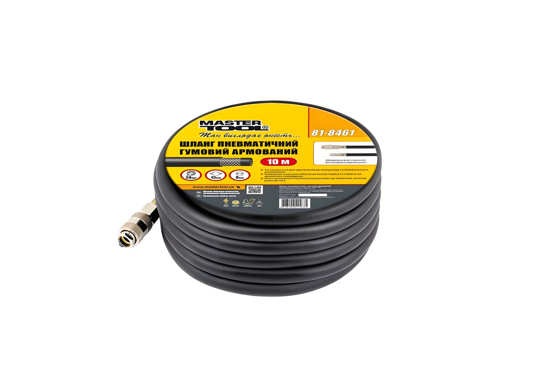 Армований пневматичний гумовий шланг 20 атм 8х15 мм 10 м із швидкознімними з'єднаннями MASTERTOOL 81-8461