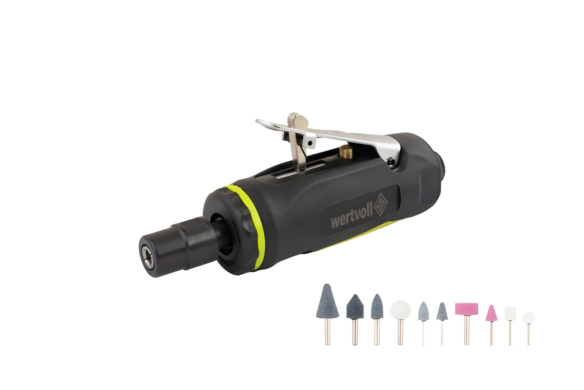 Шліфмашина пневматична пряма 1/4" цанговий затискач 6 мм 25000 об/хв 100 л/хв 6.3 bar TPR покриття корпусу кейс з насадками MASTERTOOL PN-2002
