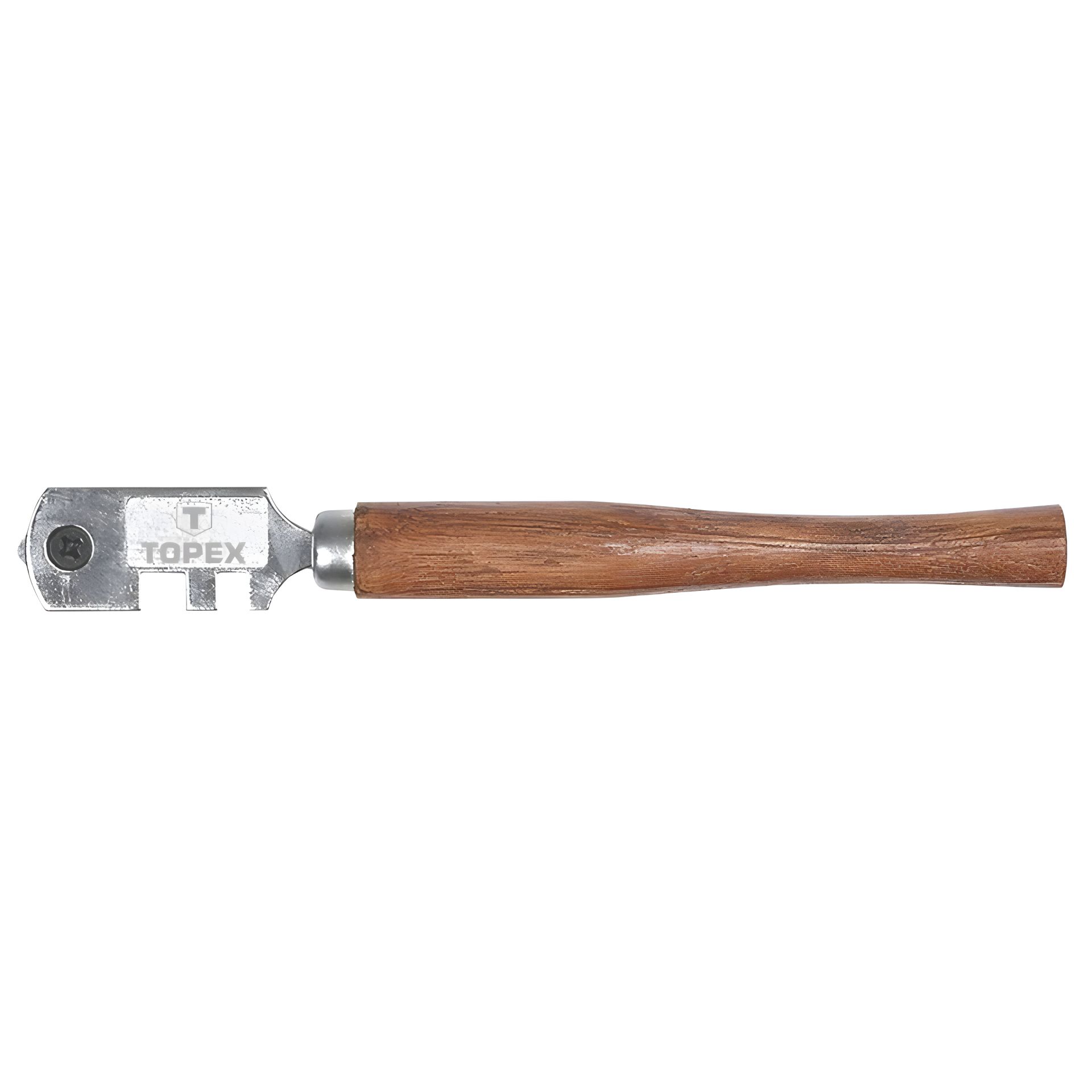 Склоріз TOPEX – це простий інструмент для різання скла. Має шість запасних ріжучих ножів, що забезпечує тривалий термін служби. Дерев'яна рукоятка добре лягає у долоню, завдяки чому робота стає комфортнішою. Перевагою інструменту є захвати на головці, призначені для відламування скла - стануть у нагоді при різанні. Бренд TOPEX призначений для домашніх майстрів.