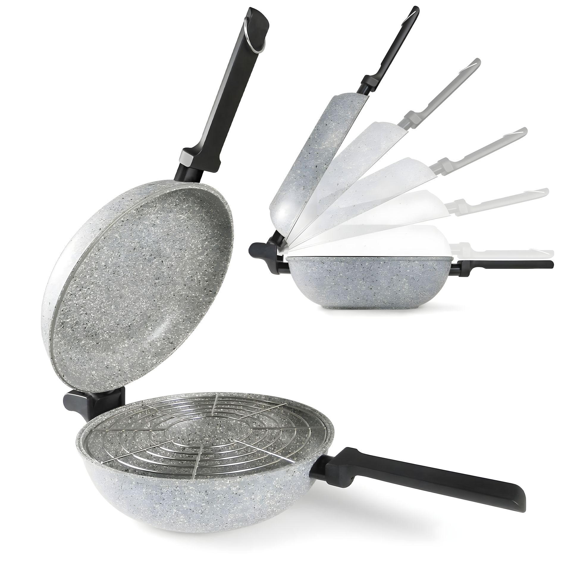 ROCKY TWINS - універсальний кулінарний мультиінструмент 5 в 1, із запатентованим механізмом з'єднання двох сковорідок. Традиційна сковорода та сковорода ВОК, що з'єднуються в подвійну сковороду, можуть використовуватись як разом так і окремо, в поєднанні з металевою внутрішньою решіткою, а також в якості кришок одна для одної, дозволяючи приготувати велику кількість страв лише за допомогою одного кулінарного девайсу.
