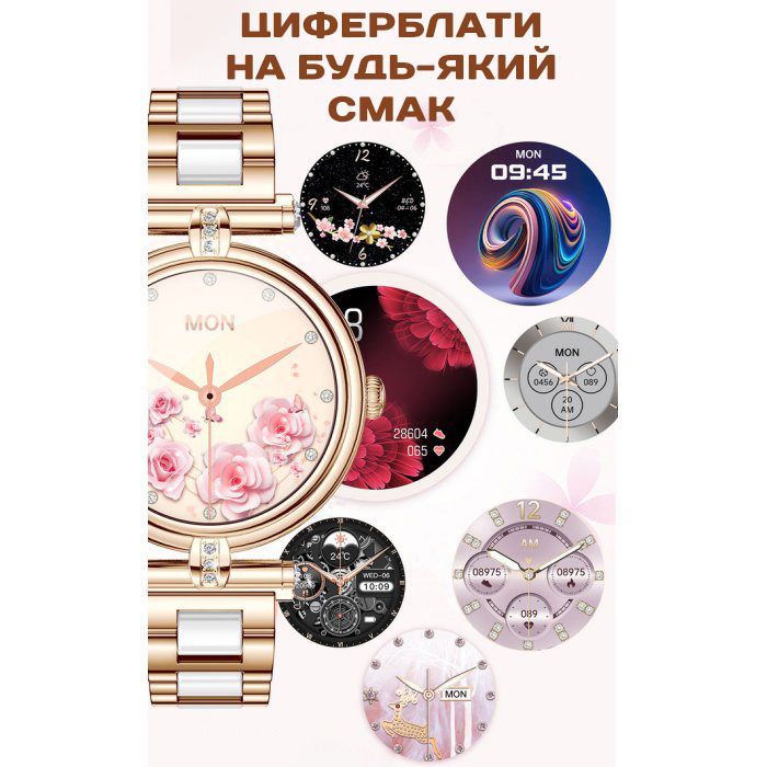 Smart Leila - елегантний смарт-годинник для жінок. Він поєднує стильний дизайн із розумними функціями, які допомагають стежити за здоров'ям і залишатися на зв'язку. Годинник має яскравий дисплей, зручний інтерфейс, понад 100 спортивних режимів, дозволяє отримувати сповіщення, керувати музичним плеєром та персоналізувати заставки. Це ідеальний аксесуар для тих, хто цінує поєднання моди та технологій.В комплекті йде безплатно додатковий ремінець та офіційна гарантія на 12 місяців.