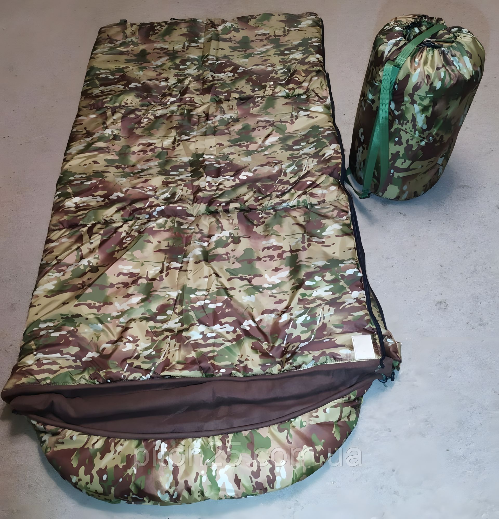Армійський широкий спальний мішок (до -25), спальник, малюнок камуфляжу - мультикам Ширина 90см! Довжина 200см Армійський спальний мішок ПІТОН Тип: ковдровий спальник з капюшоном Розмір в упаковці (Compression bag size): 40*30 см Зовнішнє покриття: наметова тканина в пікселях Наповнювач: силіконізований синтепон 400 г/м3 Внутрішнє покриття: фліс Вага: 3 кгУпаковка: компресійний мішок Температурний режим (Т): -15°С - 25°С Особливість: водонепроникний малюнок камуфляжу - мультикам Розмір спальника (широкий): 90*210см капюшон напівкруглої форми, оснащений зручною та практичною системою стягування. спальний мішок чудово зберігає тепло завдяки утепленому капюшону блискавка забезпечена клапаном-липучкою, завдяки якому вона не розстібається самостійно водовідштовхувальне просочування зовнішньої тканини створює додатковий комфорт під час вологої погоди спальник може використовуватися як ковдра силіконізований синтепон швидко відновлюють форму після стиснення, має кращу теплоізоляцію та довше служать двосторонній бігунокХарактеристики