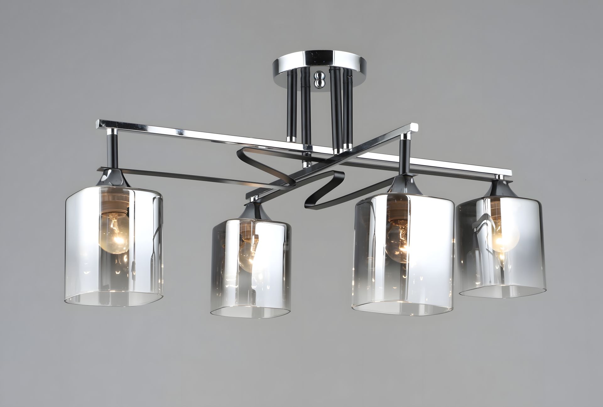 Її стильний каркас, виготовлений з металу в чорному та хромовому кольорі, надає їй сучасний та елегантний вигляд, який чудово впишеться в будь-який інтер'єр. З 4 плафонами зі скла в хромовому відтінку, ця люстра розсіює світло рівномірно, створюючи неповторну атмосферу затишку та комфорту.