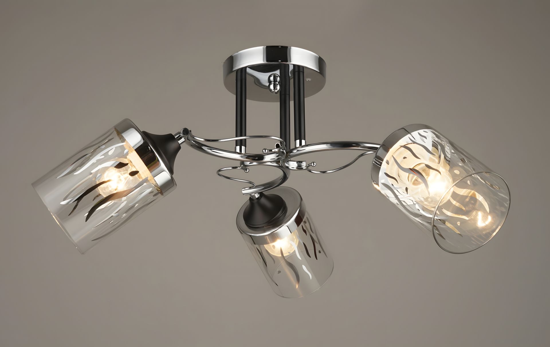 Каркас з металу в кольорі хрому та чорного надає цій люстрі елегантний вигляд, що гармонійно вписується в будь-який інтер'єр. Три плафони зі скла циліндричної форми створюють приємне та рівномірне розсіяне світло.