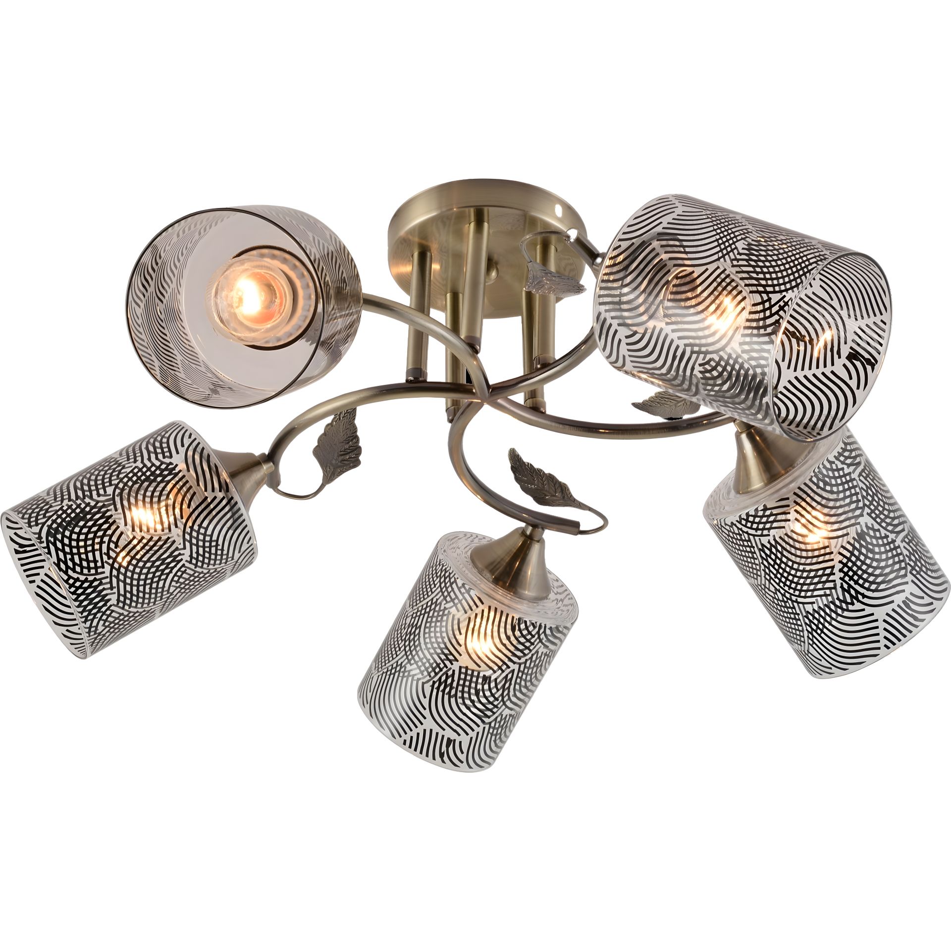 П'ять скляних плафонів забезпечують рівномірне розсіювання світла, створюючи комфортну та приємну атмосферу в будь-якій кімнаті. Завдяки стандартному цоколю E27, ви можете використовувати лампочки до 60 Ватт, що дозволяє налаштувати освітлення за вашим бажанням.