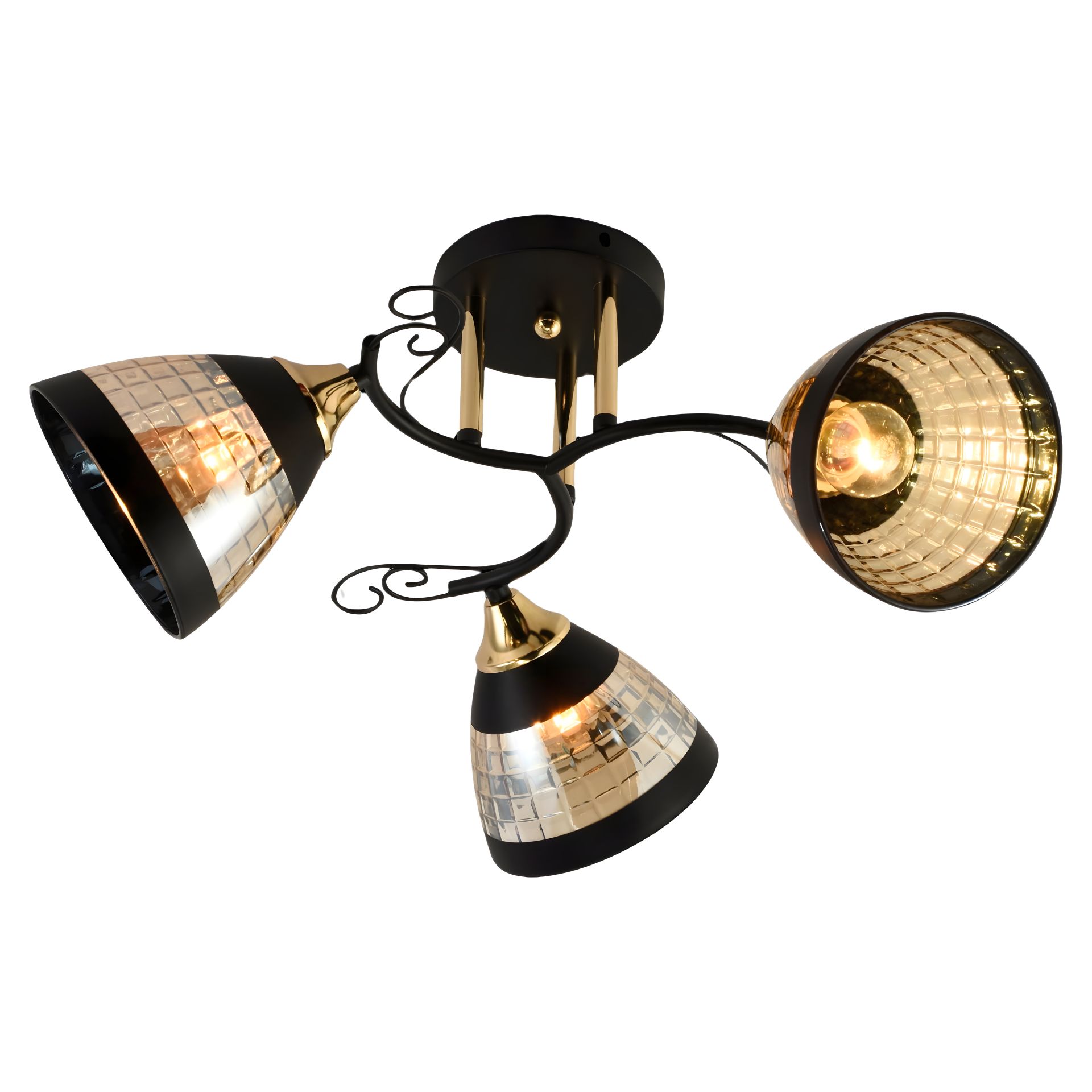 Люстра має довжину 520 мм, ширину 520 мм і висоту 250 мм, що дозволяє їй ідеально вписатися в будь-яку кімнату вашого дому. Каркас виготовлений з високоякісного металу чорного та золотого кольору, що додає виробу елегантності та сучасного вигляду. Три скляні плафони створюють вишуканий контраст, доповнюючи загальний стиль люстри.