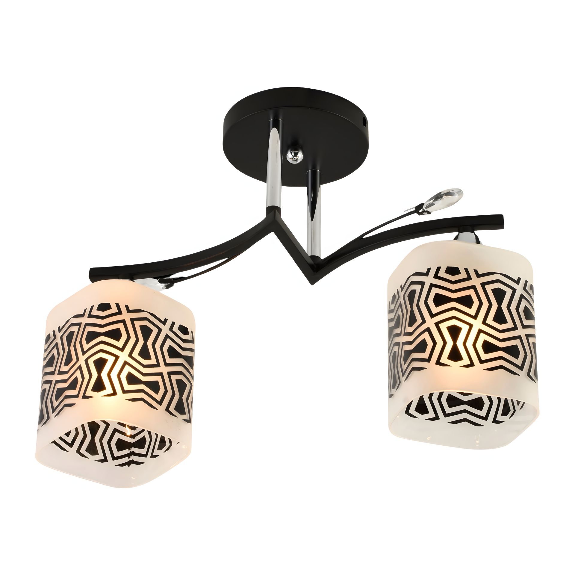 Люстра має довжину 400 мм, ширину 120 мм і висоту 280 мм, що дозволяє їй ідеально вписатися в будь-яку кімнату вашого дому. Каркас виготовлений з високоякісного металу чорного та хромового кольору, що додає виробу елегантності та сучасного вигляду. Два скляні плафони створюють вишуканий контраст, доповнюючи загальний стиль люстри.