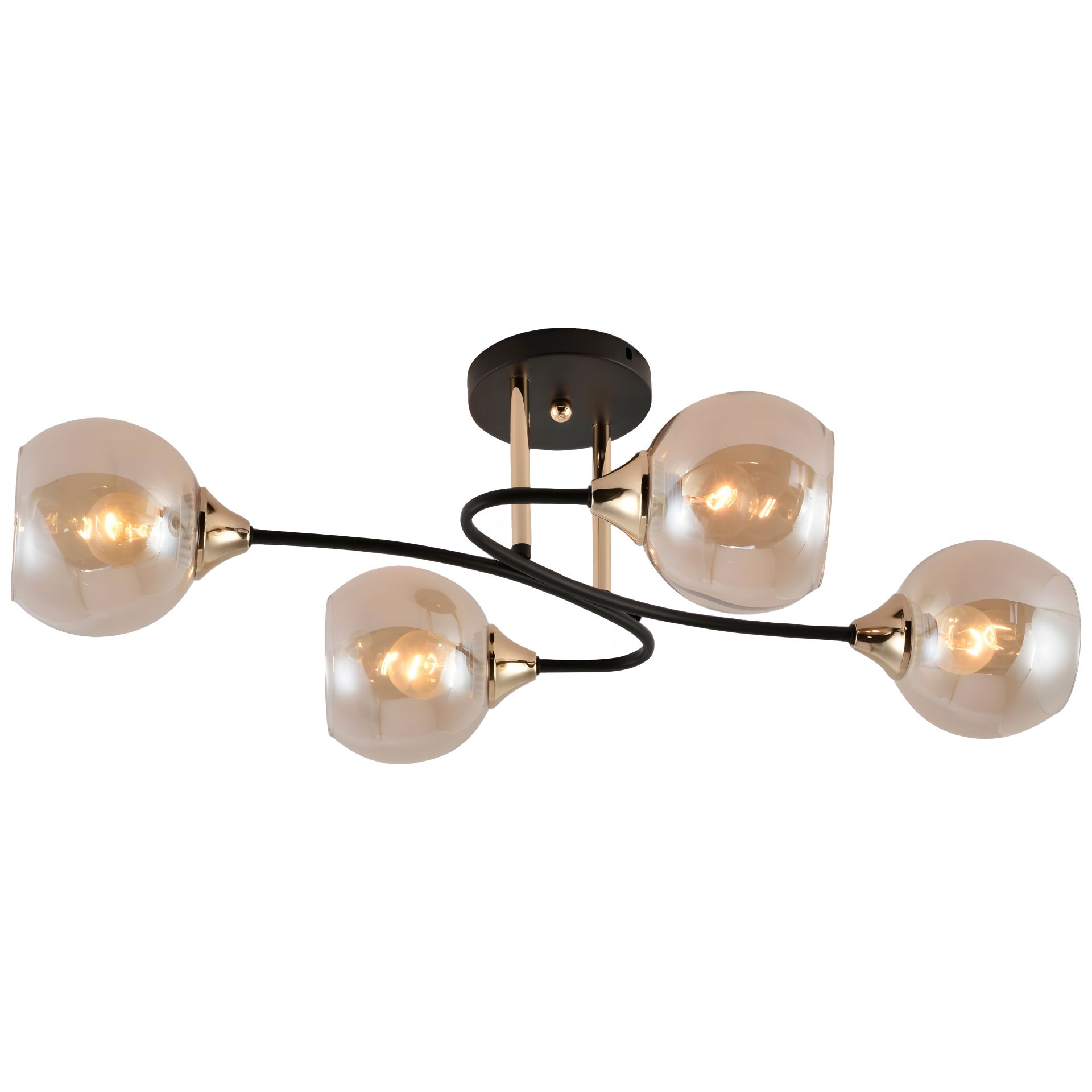 Чотири плафони зі скла в коричневому відтінку з круглими формами розсіюють світло рівномірно, створюючи теплу та затишну атмосферу. З цоколем Е27, який підтримує лампи до 60 Ватт, ця люстра гарантує яскраве та ефективне освітлення для вашого простору.