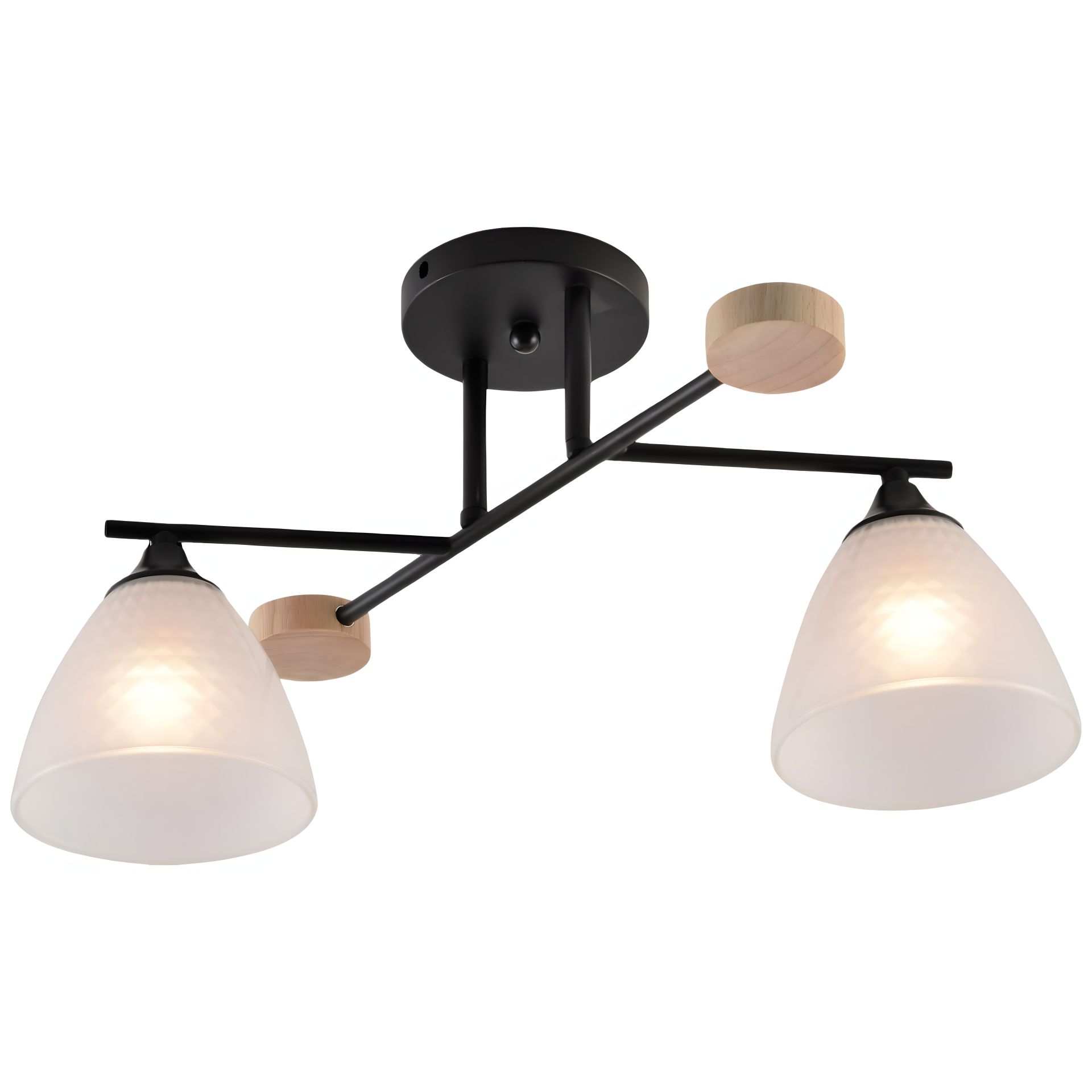 Каркас виготовлений з металу в чорному кольорі з дерев'яними елементами, що надає йому природного тепла та затишку. Два плафони зі скла в білому відтінку створюють приголомшливий ефект освітлення, додаючи вашому приміщенню неповторного шарму.
