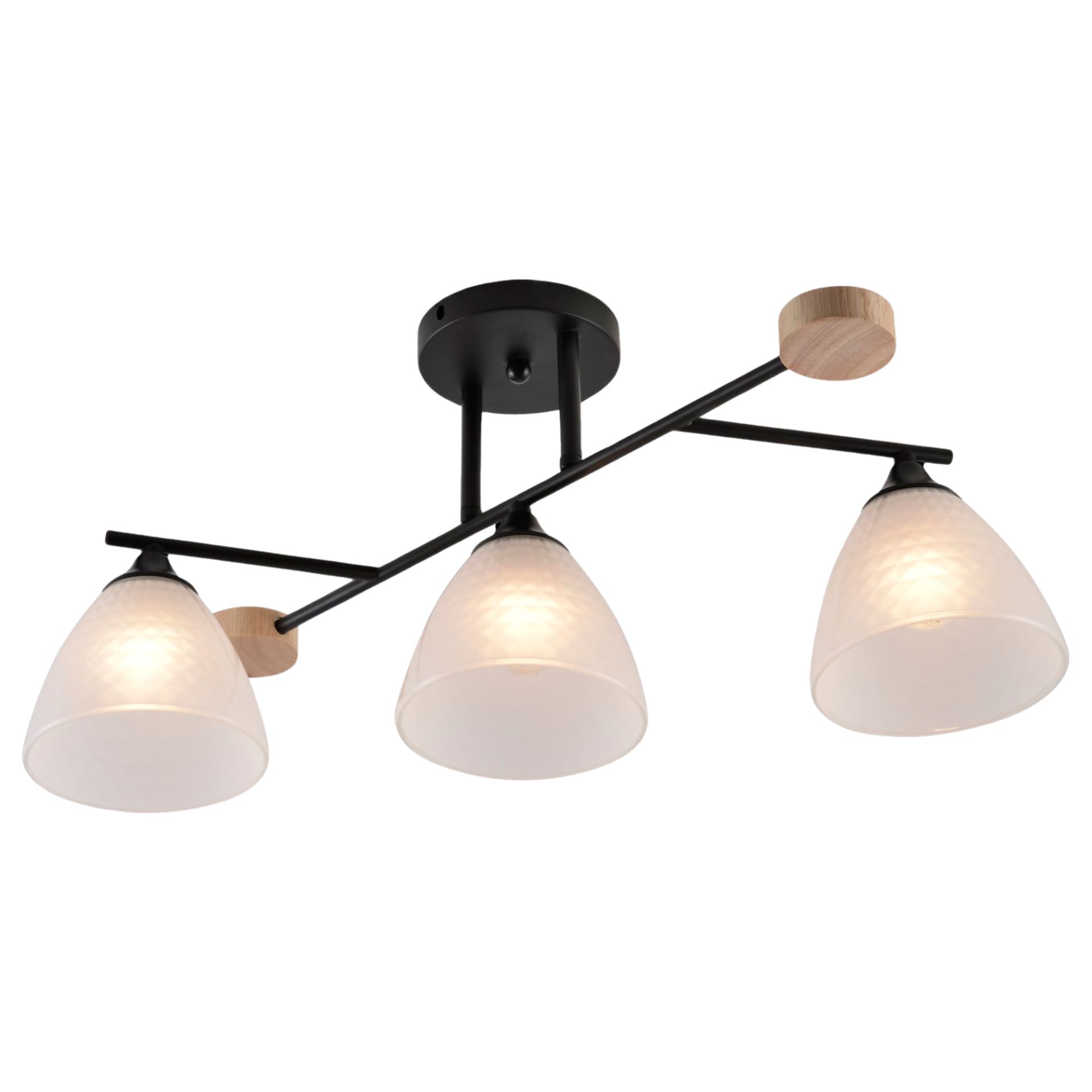 Каркас виготовлений з металу в чорному кольорі з дерев'яними елементами, що надає йому природного тепла та затишку. Три плафони зі скла в білому відтінку створюють приголомшливий ефект освітлення, додаючи вашому приміщенню неповторного шарму.