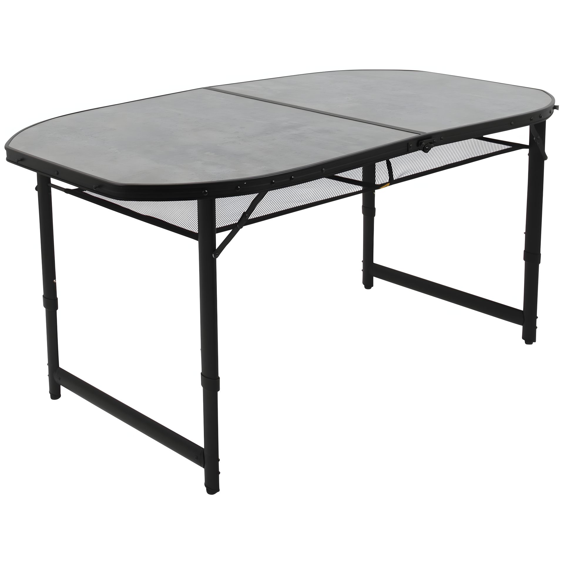 Більша версія столу Bo-Camp Northgate Oval 150x80 cm Black/Grey, відрізняється від молодшої моделі більшими розмірами стільниці і телескопічними нерозбірними ніжками, що регулюються в трьох рівнях висоти 55/65/70 см.