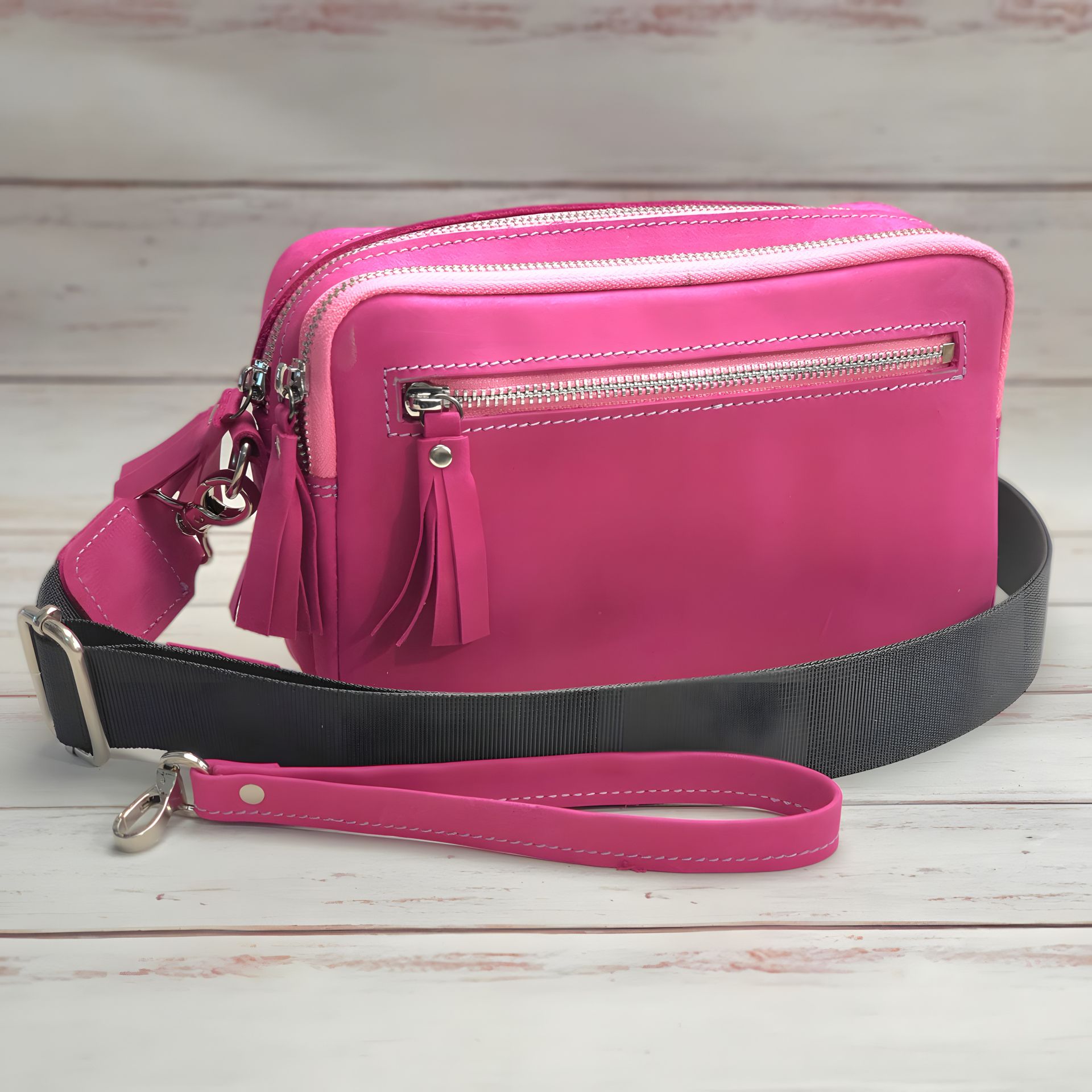 Сумка складається з 2 відділів, які закриваються блискавками. На передній фронтальній стороні розташована зручна, містка кишеня на блискавці Основне відділення має розміри 14*22*5 см. Усередині є потайна кишеня на блискавці і кишенька поменше для дрібниць. Розміри другого відділу 14*22*2 см. У ньому вшита візитниця і кишеня для дрібниць.