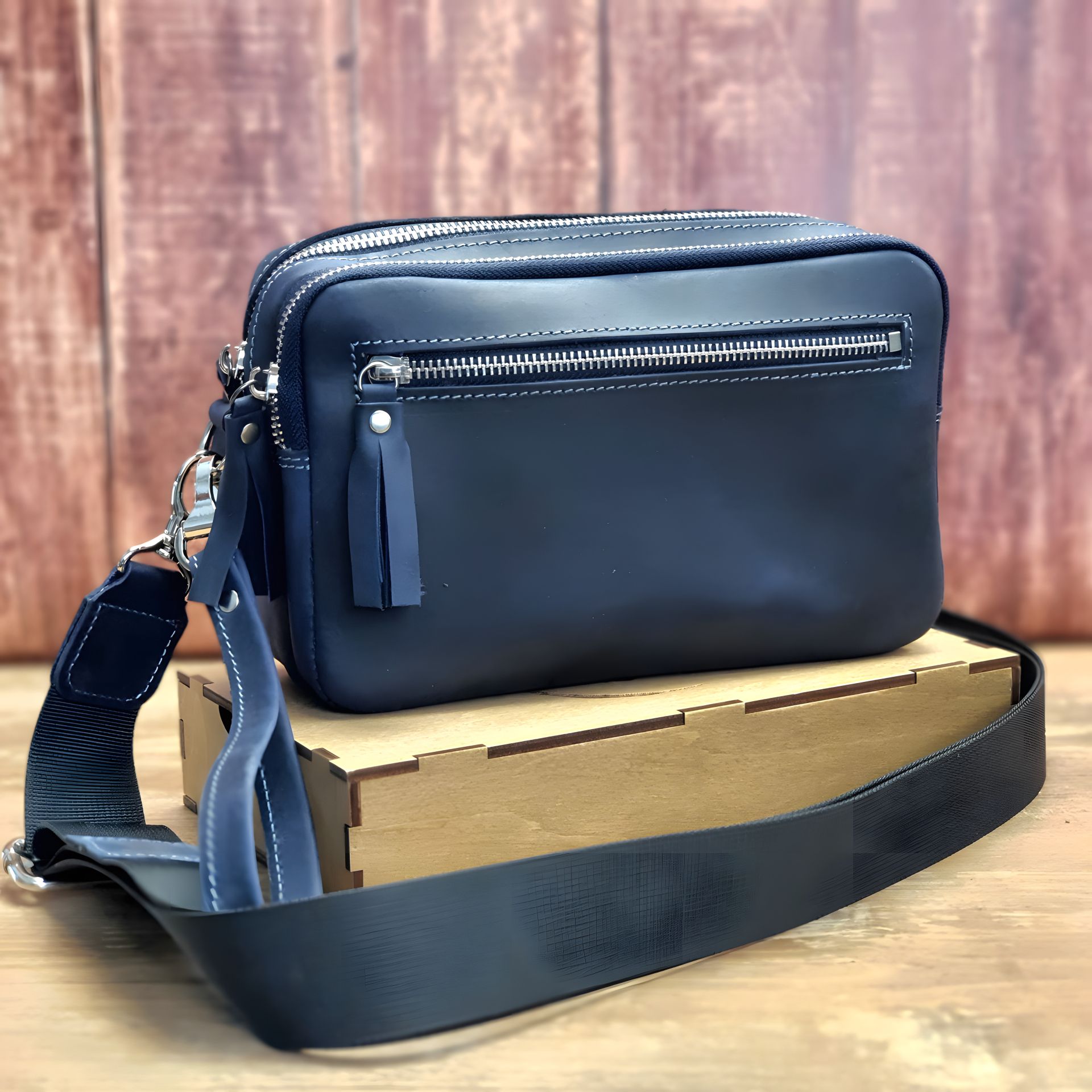 Сумка складається з 2 відділів, які закриваються блискавками. На передній фронтальній стороні розташована зручна, містка кишеня на блискавці Основне відділення має розміри 14*22*5 см. Усередині є потайна кишеня на блискавці і кишенька поменше для дрібниць. Розміри другого відділу 14*22*2 см. У ньому вшита візитниця і кишеня для дрібниць.