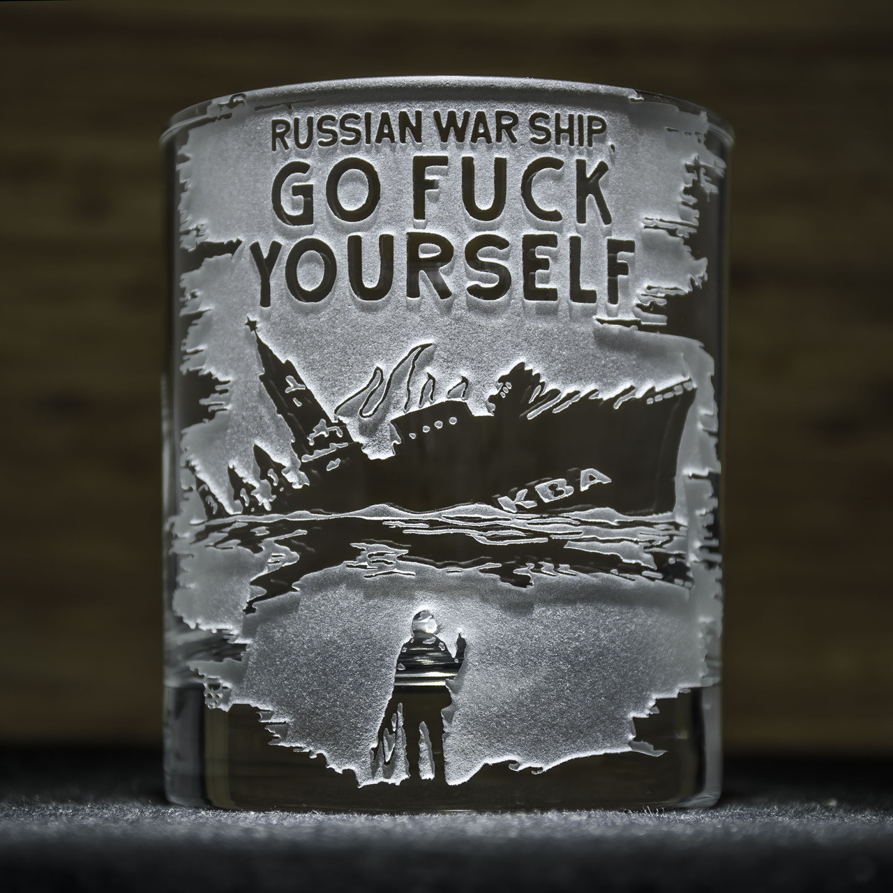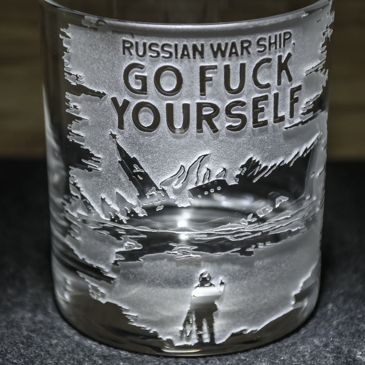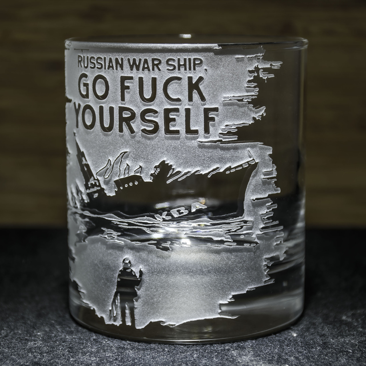 Склянка для води та віскі з ручним механічним гравіюванням russian war ship go f*ck yourself в подарунковій коробці