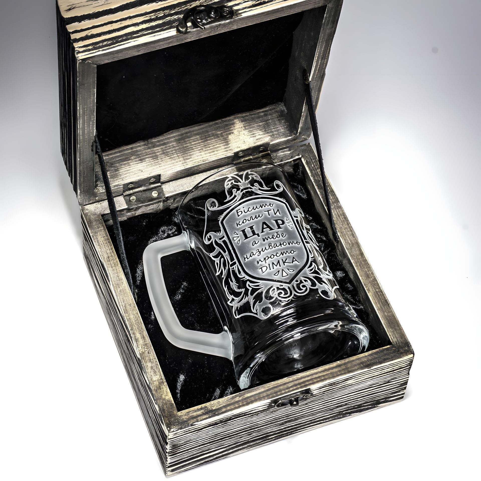 Іменний подарунковий пивний келих з прикольним гравіюванням в дерев'яній скриньці
