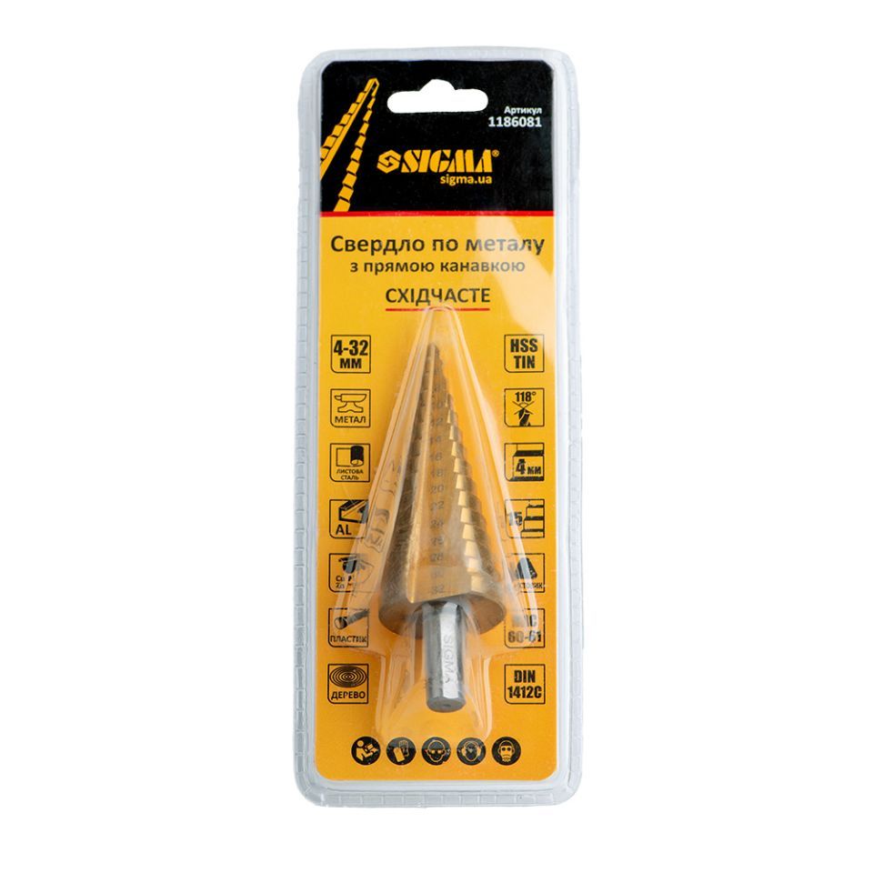 Свердло по металу ступінчасте HSS-TIN титанове з прямою канавкою Ø4-32мм, крок 2мм (блістер) SIGMA (1186081) призначене для поетапного отримання отворів різного діаметру без перестановки ріжучого інструменту в листових, тонкостінних металевих та пластикових конструкціях та заготовках. При роботі рекомендується використання мастильно-охолоджувальних рідин.