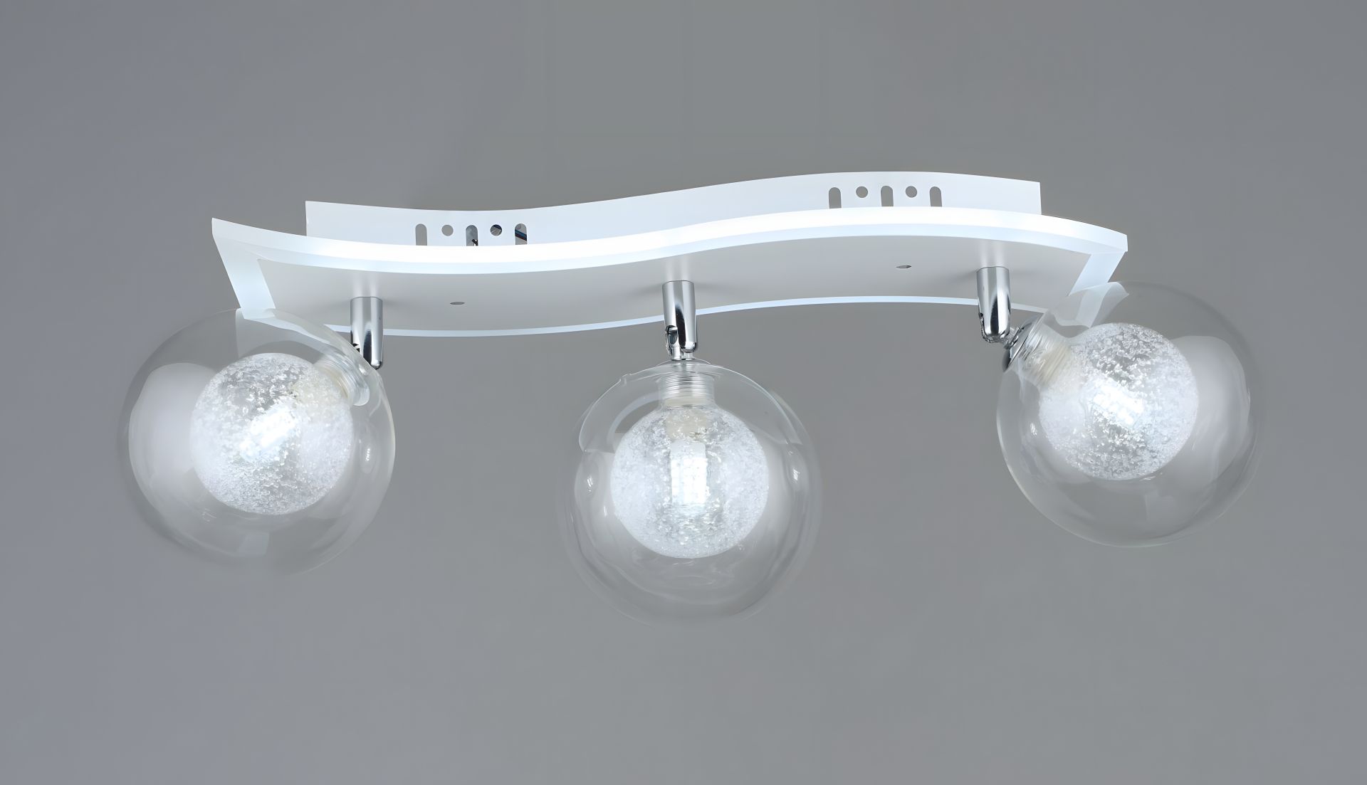 Завдяки білому металевому каркасу, ця люстра надає вашому інтер'єру сучасний вигляд. Три круглі прозорі плафони зі скла гармонійно розсіюють світло та додають неповторного відблиску.