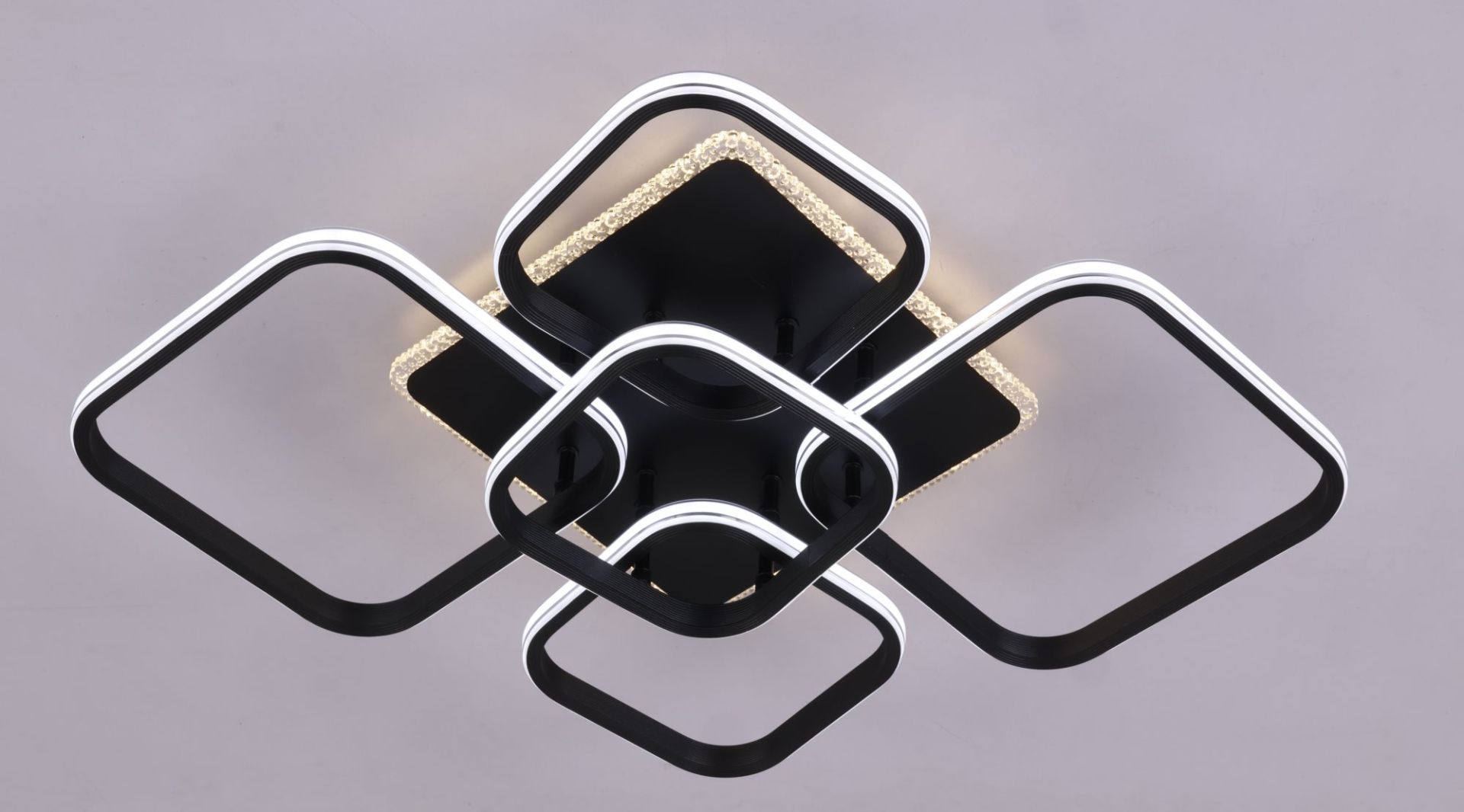 Люстра виконана в чорному кольорі, що надає їй суворого та стильного вигляду. Завдяки високій потужності (144W+36W), вона ідеально підходить для освітлення великих приміщень, таких як вітальні або зали. Розміри 770x580x130 мм дозволяють їй гармонійно виглядати на стелі, не перевантажуючи простір.