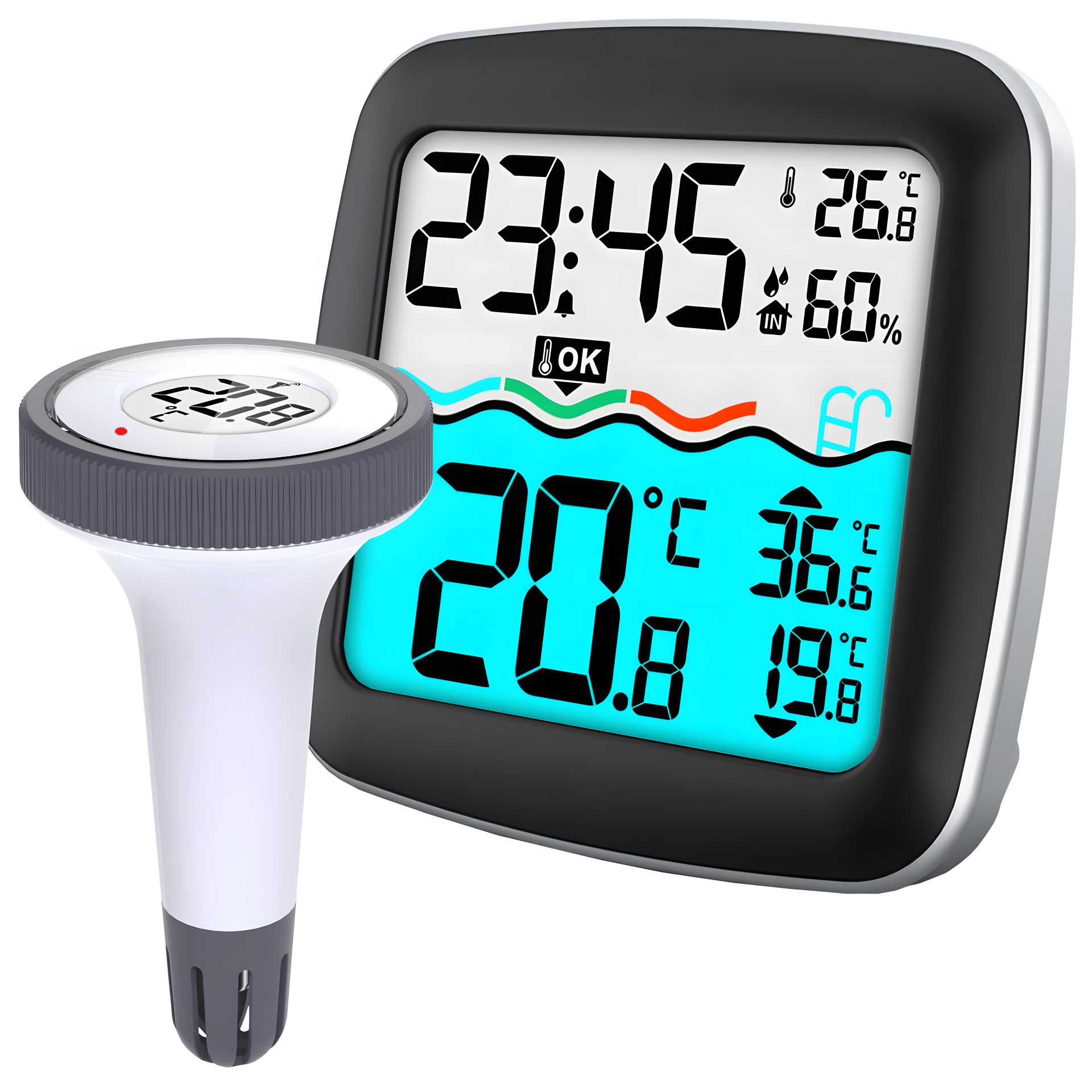 Тепер ви можете слідкувати не тільки за мікрокліматом в SPA зоні, а ще й контролювати температуру води в кількох водних зонах одночасно. Technoline WS9059 - це термогігрометр що вимірює температуру води в басейні і може підтримувати до 3-х бездротових датчиків одночасно. Датчик водонепроникний і обладнаний власним екраном для выдображення температури води. Він може передавати данні на відстань до 60 метрів за допомогою радіосигналу на основний блок, встановлений у приміщенні. При цьому основний блок також вимірює внутрішню температуру, вологість і показує мінімальні і максимальні значення цих параметрів, та додатково обладнаний годинником з будильником.