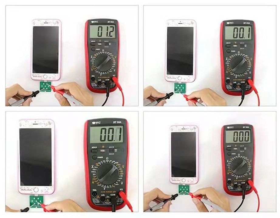 Метод підключення: пряме підключення до роз'єму телефону, щупи мультиметра ставляться на відповідні майданчики