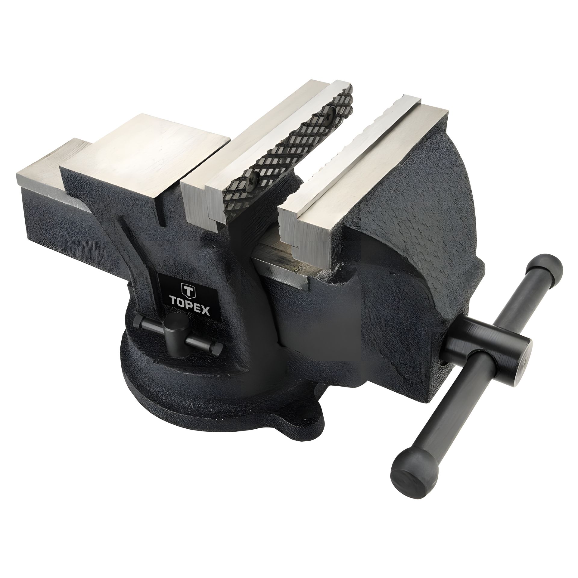 Тиски слюсарні поворотні TOPEX з високою силою затискання губок. Призначені для закріплення предметів, що обробляються ручним або машинним способом. Міцна, чавунна конструкція з ковадлом і загартованим різьбленням дозволяє використовувати лещата для важких робіт. Поворотна основа дає можливість розташувати предмет у найбільш зручній для роботи позиції. Бренд TOPEX призначений для домашніх майстрів.