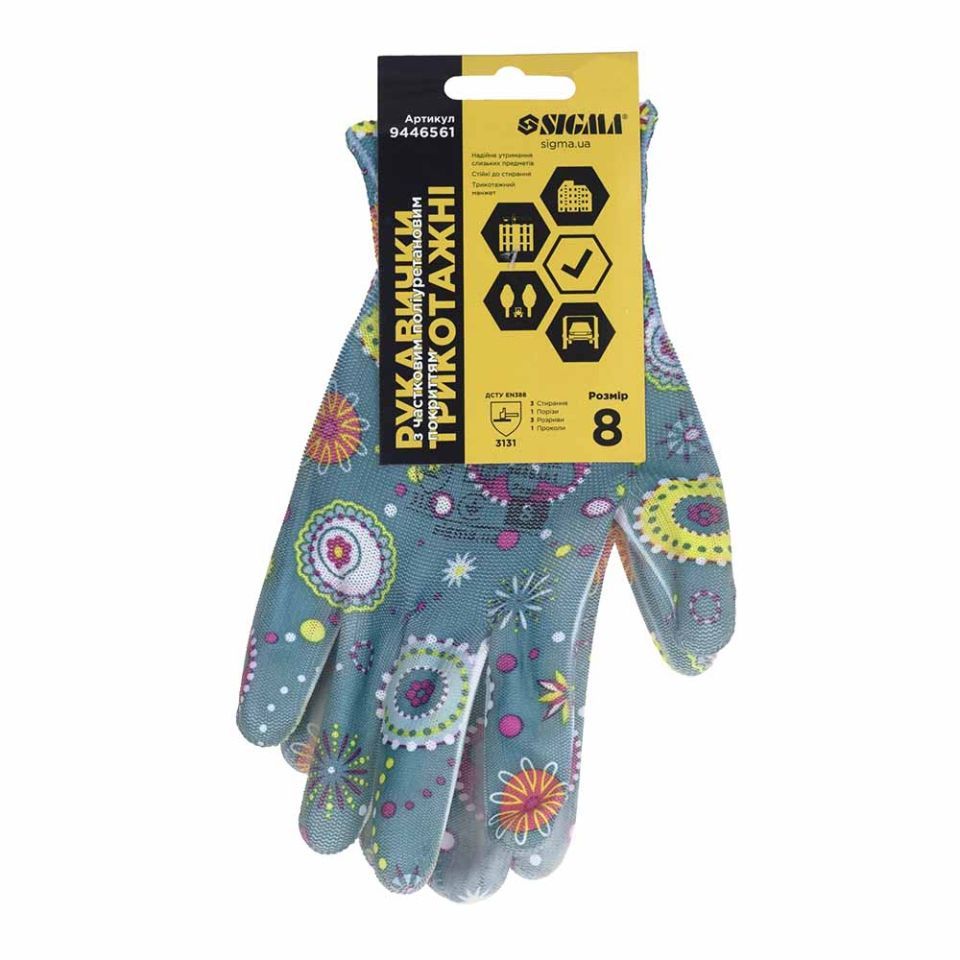 Трикотажні рукавички з частковим ПУ покриттям р8 (сині, манжет) SIGMA (9446561) призначені для захисту рук від механічних впливів.