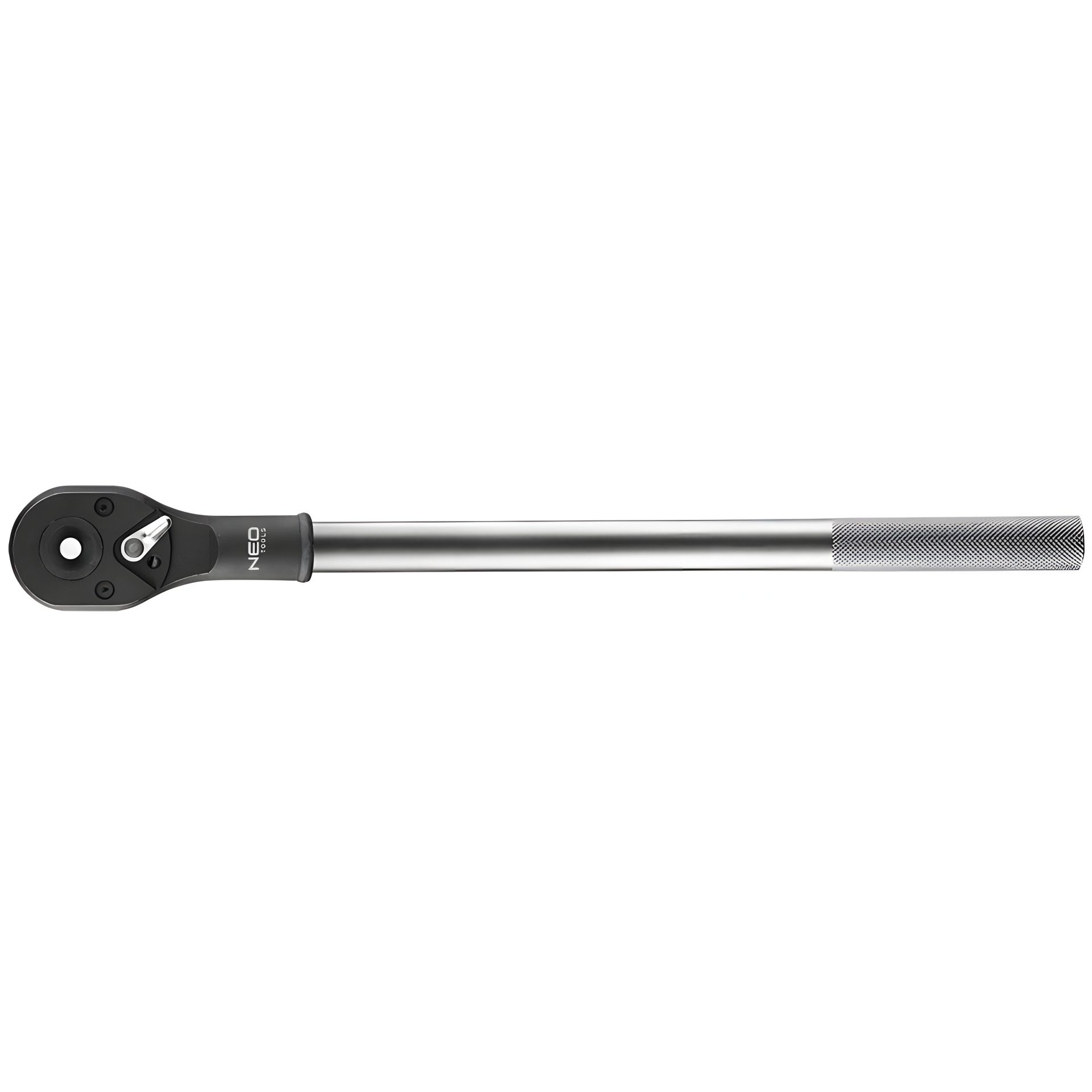 Тріскачка 3/4" NEO довжиною 500 мм, корпус з хромованадієвої сталі. Храповий механізм з 24 зубцями виготовлений з міцної хромомолібденової сталі, що збільшує термін служби інструменту. Призначена для роботи з великими навантаженнями. Якість інструменту підтверджена сертифікатом TÜV і 25-річною гарантією виробника.