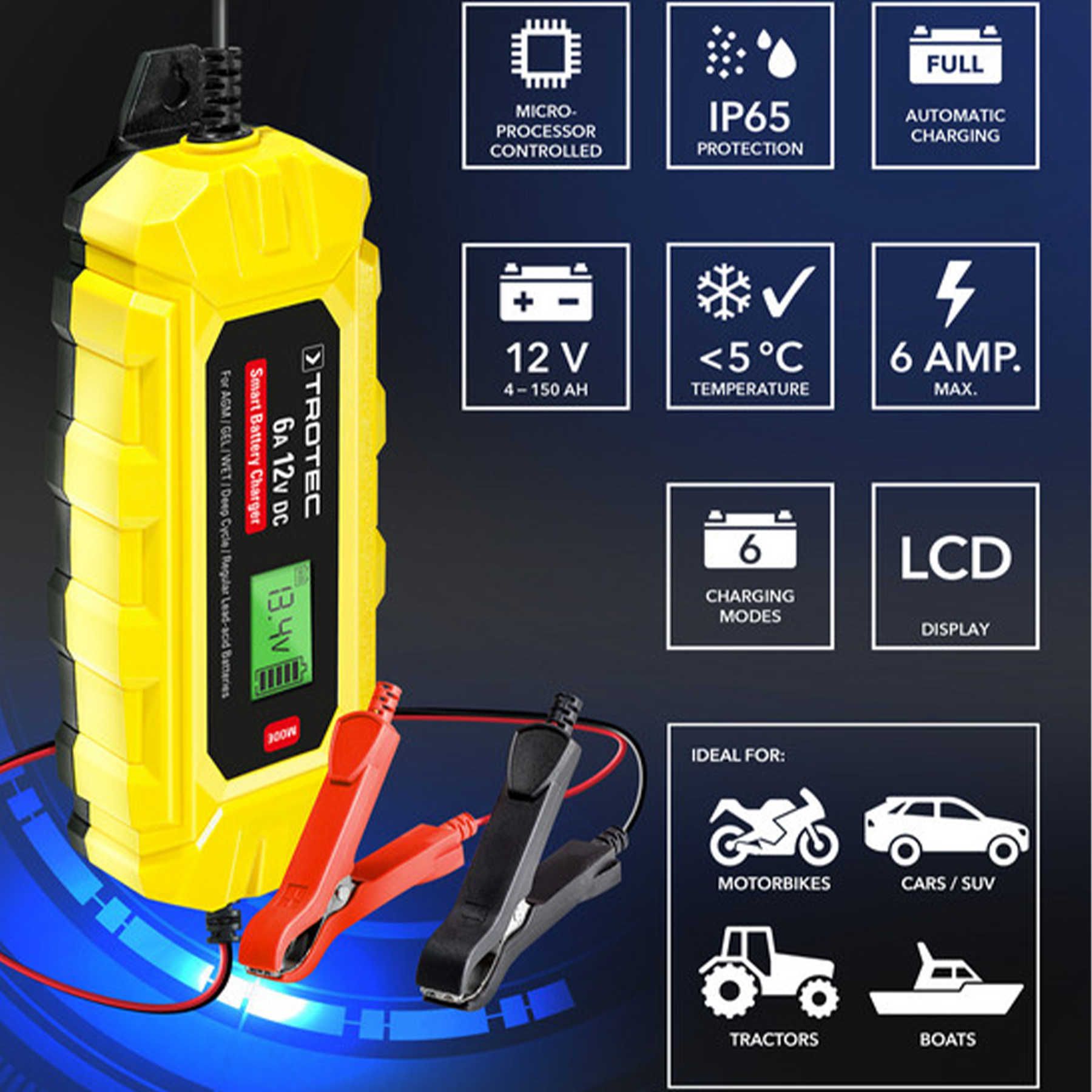 Портативний зарядний пристрій Trotec PBCS 6A з зарядним струмом 6 А та РК-дисплеєм з підсвічуванням є мікропроцесорним універсальним зарядним пристроєм із 10-етапним циклом заряджання. Підходить для швидкого заряджання, відновлення після глибокого розряду або збереження всіх налаштувань під час заміни батареї. Завдяки сучасному оснащенню Trotec PBCS 6A рекомендовано для догляду за 12-вольтними акумуляторами від 4 Ah до 150 Ah.